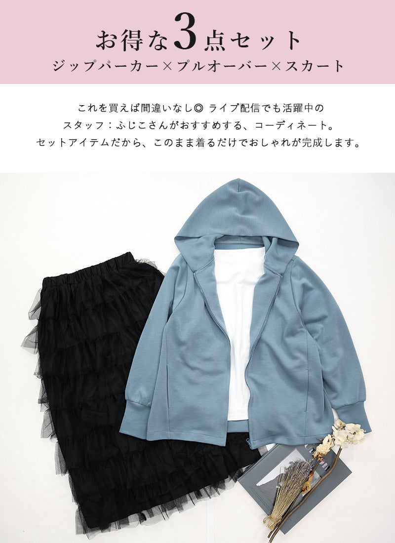 他の画像を見る 届いてすぐに楽しめる!大人可愛いMIXコーデが完成するジップパーカー・カットソー・チュールスカートの3点セット。 春のカジュアルMIXスカートコーデ M 【メール便対応不可】 コーデセット 販売価格 ¥ 8,999 税込 カートに入れる お気に入りに登録する