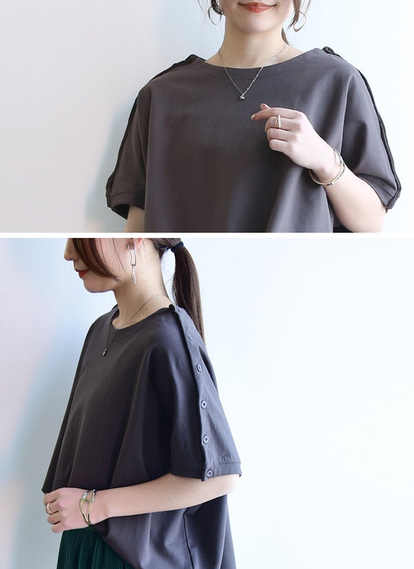 シンプルなのに差がつく、ショルダーボタンデザイン。ゆったりビッグTで、ラクしておしゃれが完成。