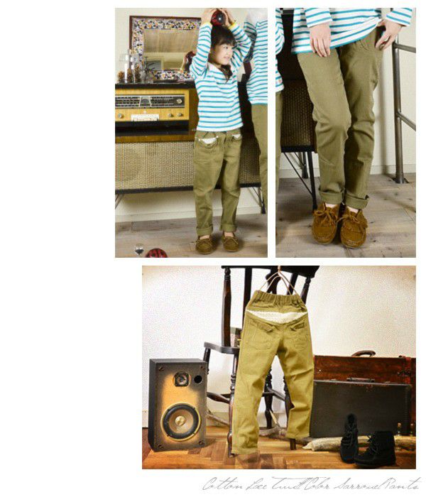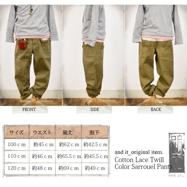 【120】ウエスト:約48cm、ヒップ:約73cm、股上:約23cm、股下:約49cm、ワタリ:約21.5cm、裾幅:約13.5cm、総丈:約69cm