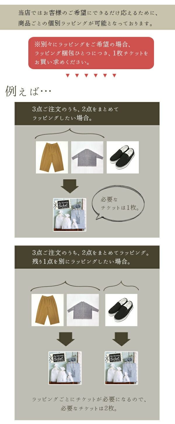 ※別々にラッピングする場合、ラッピング梱包1つごとにお買い物かごにチケットを1枚追加して下さい。