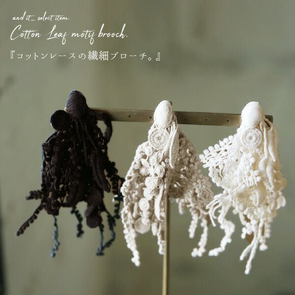 コットンのナチュラルな風合いがお洒落なリーフブローチ。立体感のあるレースが大人コーデのワンポイントに♪
