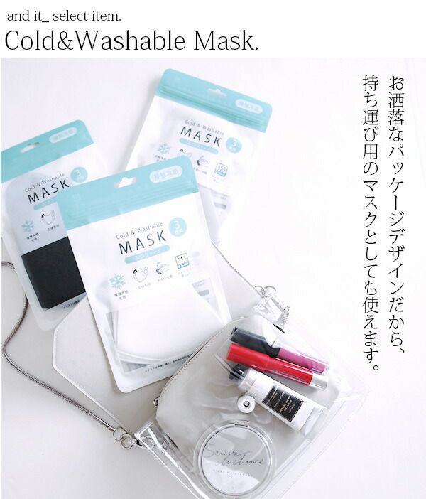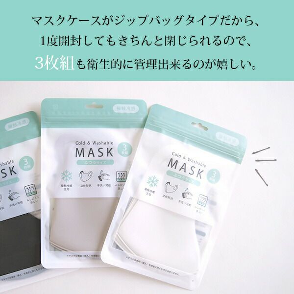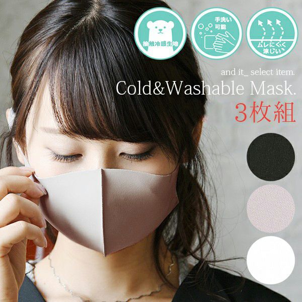 素材独自の接触冷感性により、装着時のひんやり感を実現しました。通気性もよいので暑い時期にも蒸れにくく、涼しい仕様に。立体形状で顔の輪郭に自然にフィットし、耳も痛くなりにくい柔らかい素材です。お家で中性洗剤を使用した手洗いが可能なのでお手入れも簡単♪1袋に3枚入っているので通勤や通学など、洗い替えにも◎シンプルでスタイリッシュなデザインはシーンを選ばずお使い頂けます。