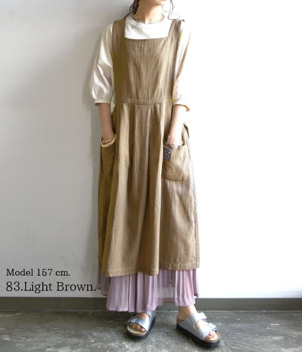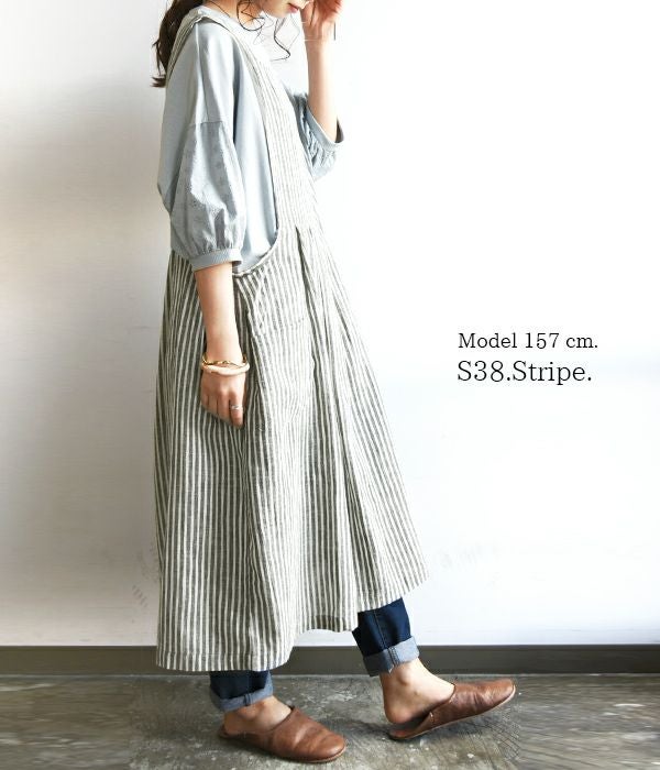 通気性に優れ清涼感のあるコットンリネン素材を使用したワンピース風のエプロン。洗いをかけるたびに肌に馴染む風合いを楽しめます。ウエスト切替にタックをあしらい、ふんわりと程よいボリュームのある女性らしいシルエットです♪両サイドには便利なポケットがついているのも嬉しいポイント!デイリー使いから母の日のプレゼントとしてもオススメです☆