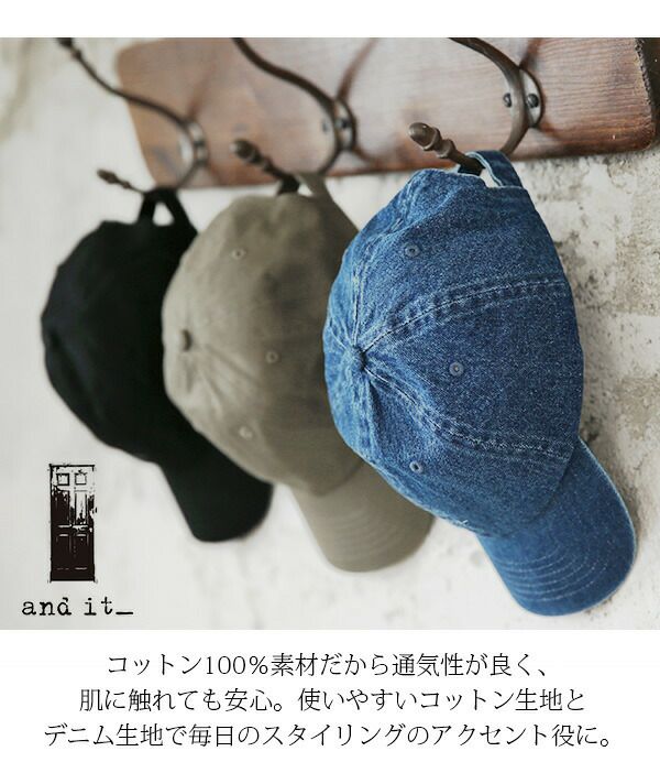 アンドイットからオリジナルロゴの入ったコットンキャップが登場。6枚のパネルからなる丸みのあるフォルムで頭にフィットします。バックにはサイズ調節が出来るアジャスターがデザインされていて自分好みのサイズ感で被る事が出来ます。コーデにプラスしやすいシンプルなデザインなので色んなスタイリングに組み合わせ可能。使いやすいデニム地とコットン生地の2種類から選べるのも嬉しいポイント。