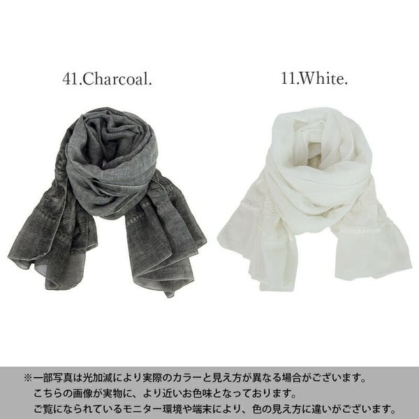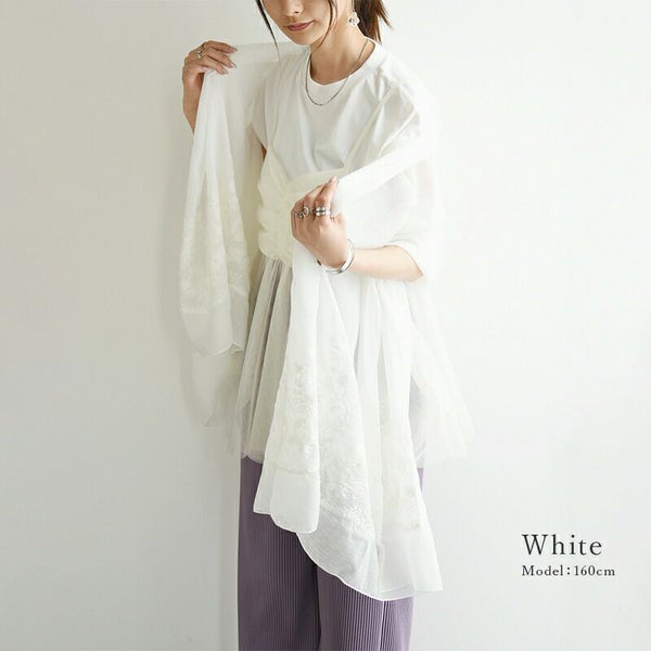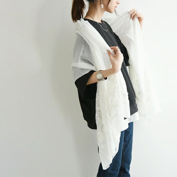 春夏にぴったりなお洒落ストールが登場!透け感が涼し気で、さりげなく刺繍された花模様がナチュラルで上品な印象です。薄手で柔らかな肌触りなのでさっと羽織ることができ、夏の冷房対策や日除けにも◎大判サイズなので、首に巻いたり羽織ったりとアレンジ自在。いつものコーデに取り入れるだけで旬のスタイルが出来上がります♪