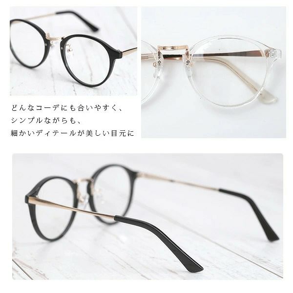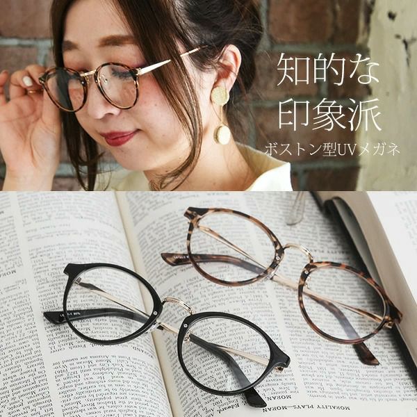 ヴィンテージ感漂うおしゃれなデザイン。ボストンタイプの伊達めがねが登場です。丸みのあるフレームは顔なじみが良く、さらりと着けるだけでお洒落な印象に。レンズにはUVカット加工が施されているのでおしゃれを楽しみながら紫外線対策もできるスグレモノ。定番のブラックと、レトロな雰囲気が可愛いべっ甲風デザインのブラウン、モード感あるクリアの計3色でご用意しました。