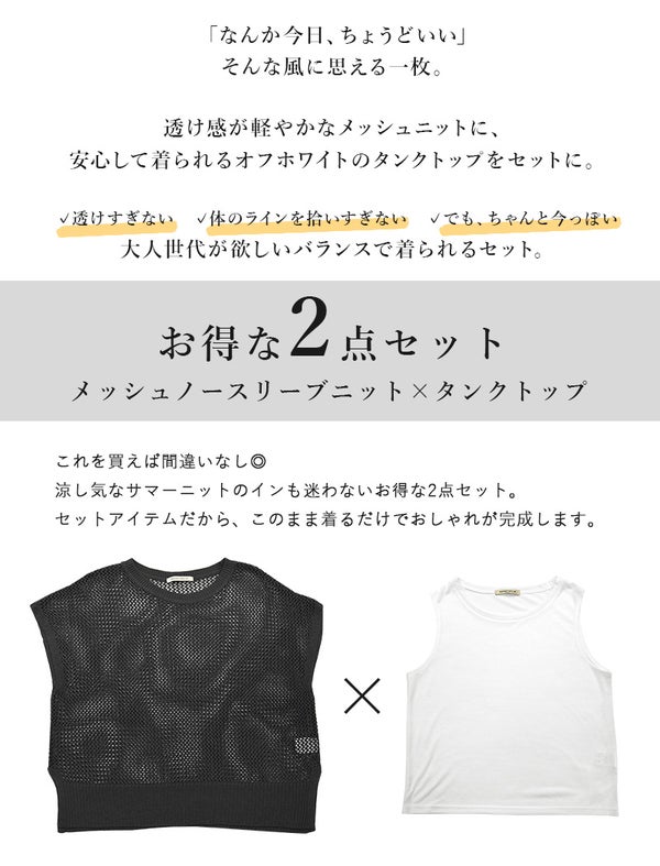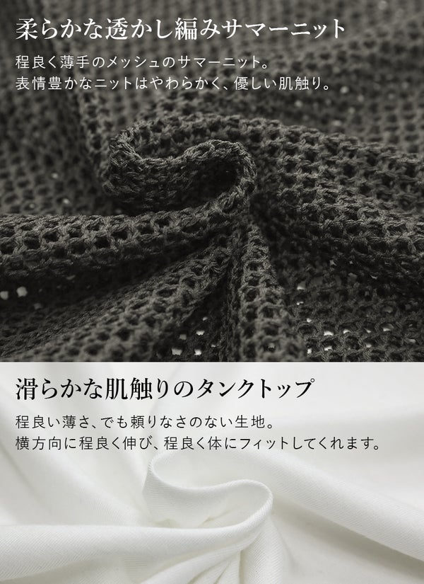メッシュニット タンクトップ セット レディース 透かし編み ノースリーブ 2点セット トップス インナー 春 夏 体型カバー レイヤード サマーニット 涼感 きれいめ 大人カジュアル アイボリー スミクロ 白 黒 新作 NEW ニュー カジュアル かじゅある ナチュラル なちゅらる 女性 綺麗 綺麗目 綺麗め きれいめ キレイメ キレイめ きれい キレイ 可愛い かわいい カワイイ カッコいい かっこいい 格好良い カッコイイ 大人 オトナ おとな オトナカワイイ おとなかわいい 大人可愛い 大人女子 おとなじょし オトナジョシ お洒落 おしゃれ オシャレ トレンド 旬 とれんど 流行 こなれ感 こなれ 高見え 上質 上品 シンプル ニュアンス ラクチン らくちん 楽ちん 楽 動きやすい ゆったり ゆる ゆったりサイズ ゆるカジ ゆるい ゆるファッション 体型カバー プラスサイズ 大きいサイズ ビッグ ビック big ビックシルエット ビッグシルエット ビックサイズ ビッグサイズ オーバーサイズ オーバー フリーサイズ フリー S M L LL 2L XL 3L XXL LLL 着痩せ 着回し 華奢見せ 華奢見え ベーシック プチプラ ファッション レディースファッション レディファ カジュアルコーデ 大人コーデ オトナコーデ 大人カジュアルコーデ きれいめコーデ きれいめカジュアルコーデ オフィスカジュアルコーデ オフィスカジュアル オフィス テレワーク リモートワーク リモート オンライン飲み会 飲み会 打ち上げ ご飯会 ランチ おうち時間 お家時間 デート お出かけ フェス リゾート ビーチ 海 旅行 飛行機 パーティー パーティ 韓国ファッション 韓国コーデ 韓国風 韓国 母の日 母のひ プレゼント ギフト 贈り物 クリスマス 誕生日 春 夏 秋 冬 春夏 秋冬 andit_ and it_ andit ANDIT_ ANDIT あんどいっと アンドイット 20 30 40 50 60 20代 30代 40代 50代 60代