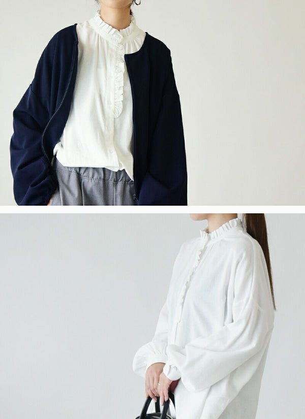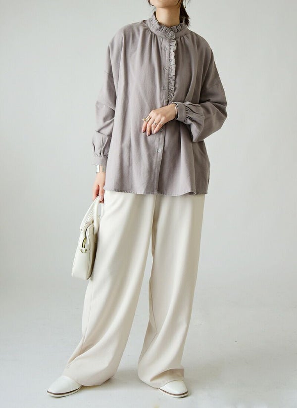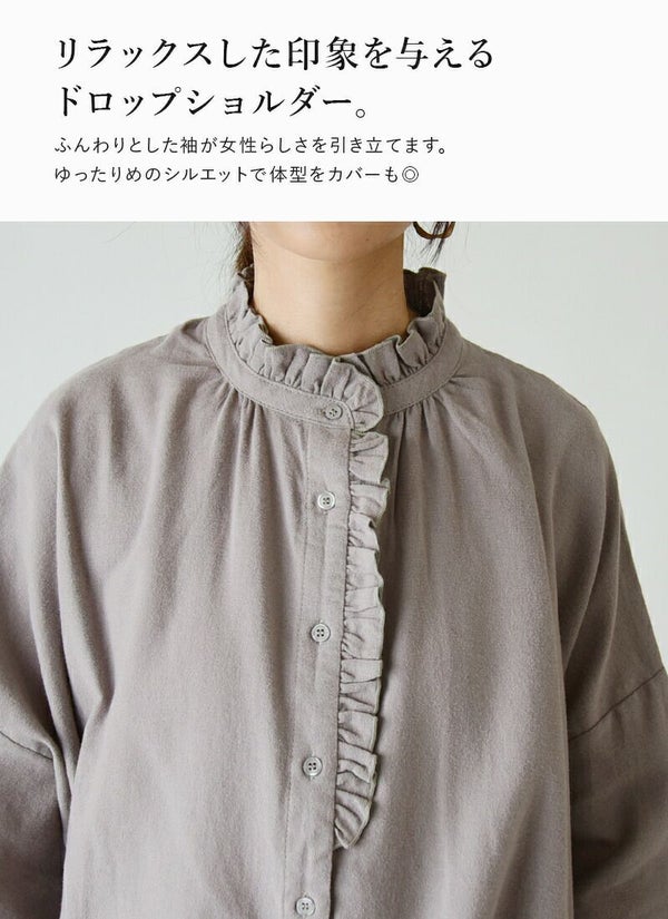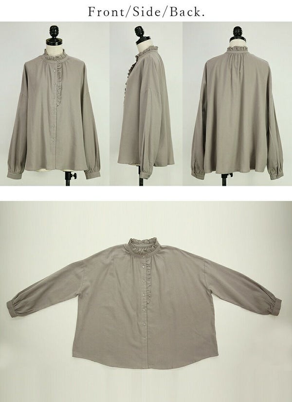 フリルデザインで女性らしい雰囲気に♪ほっこり起毛生地が秋冬感漂う着回しブラウス。