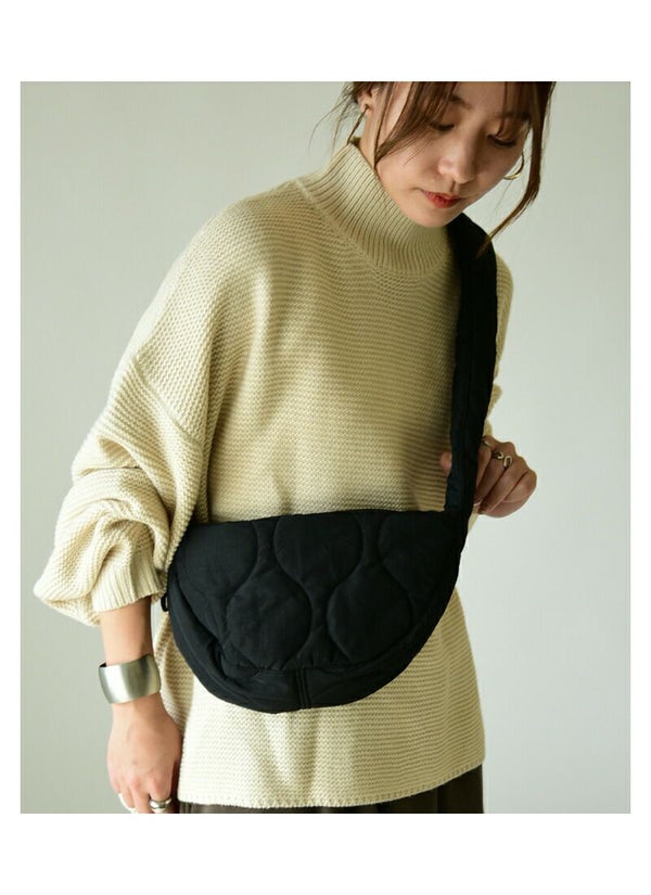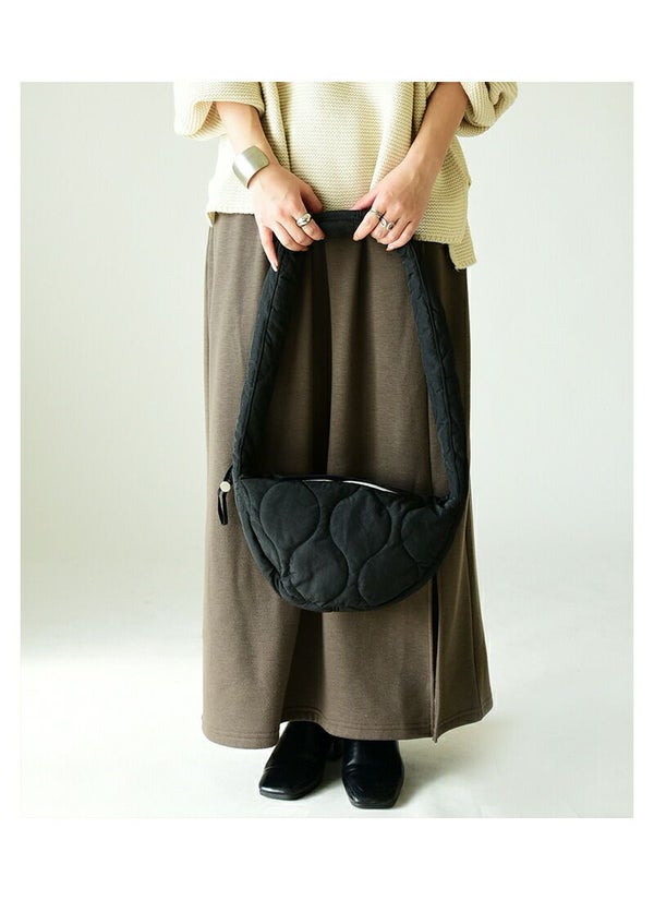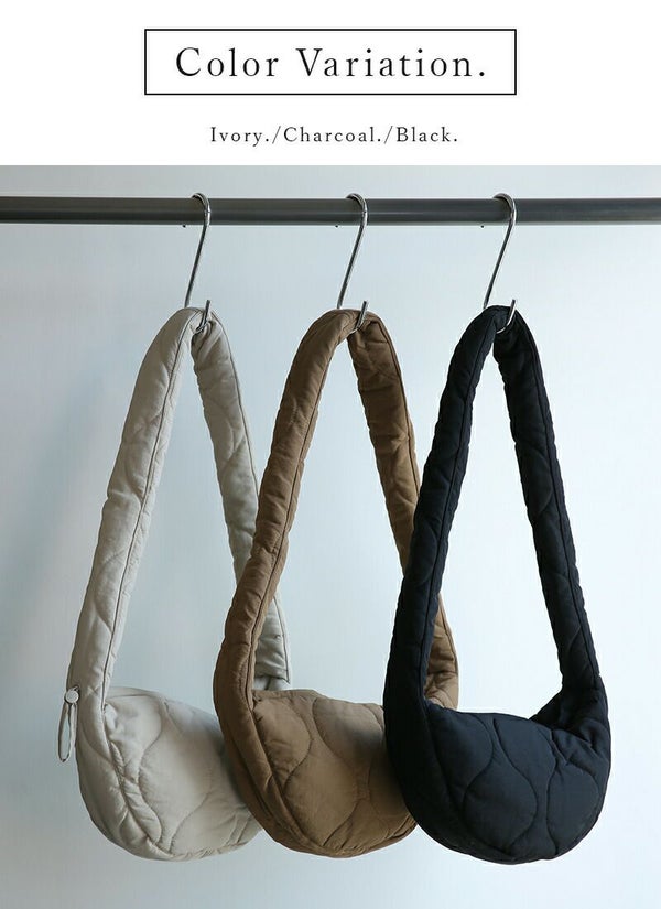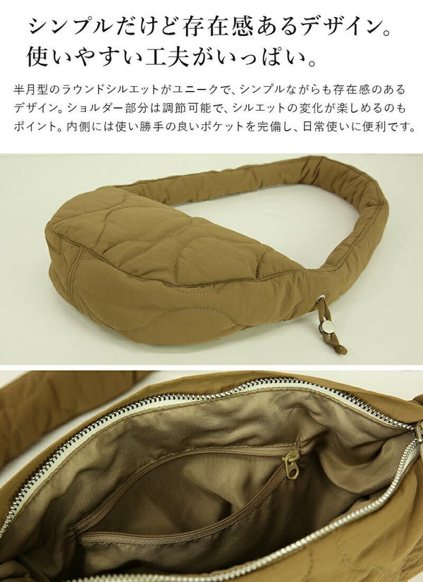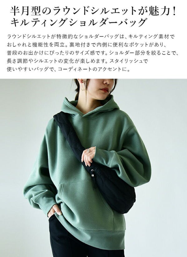 半月のようなラウンドシルエットがポイントのショルダーバッグが登場!トレンドのキルティング素材で持っているだけでコーデのポイントに♪撥水加工が施されているので雨の日も安心してお出掛けできます。内側は裏地付きでポケットもついているので小物を入れるのに便利な仕様に。サイドの紐を引いて調整すれば持ち手の長さを調節でき、クシュッとフリルのようなデザインに変身!普段のお出かけにちょうど良いサイズ感です。