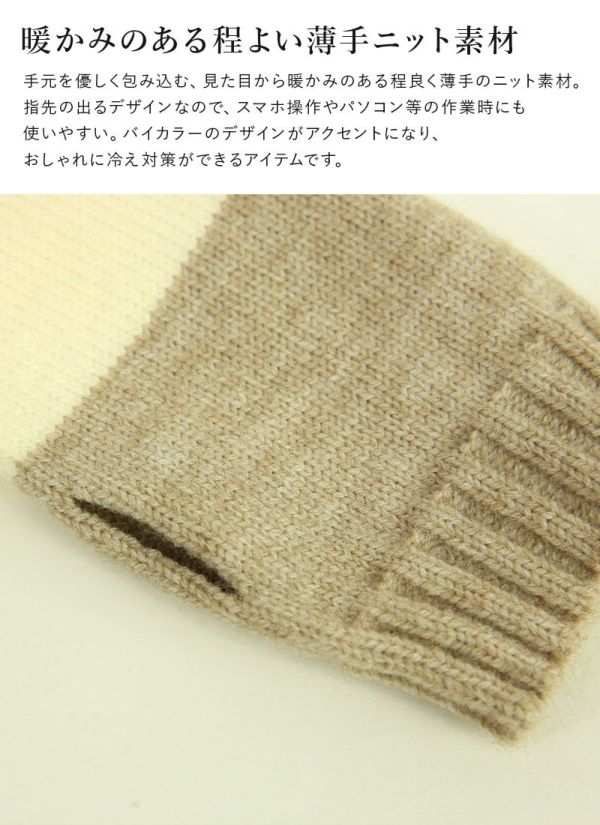バイカラーがお洒落なハンドウォーマーが登場!大人っぽい配色のバイカラーで、アウターからチラっと覗かせても可愛いデザインです。指先が自由に使えるオープンタイプなので、スマホやパソコン等の作業時にも使いやすいのが◎デイリー使いにぴったりな防寒アイテムです♪