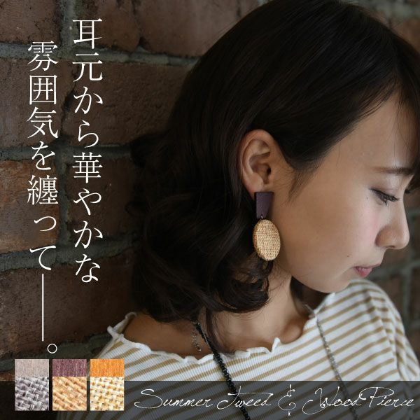 他の画像を見る 上品ツイードと優しげなウッドの異なる素材がこなれたポイントのピアス。揺れるデザインが耳元と顔周りを華やかな印象に♪ サマーツイード×ウッドピアス 【メール便対応不可】 販売価格 ¥ 1,499 税込 カートに入れる お気に入りに登録する
