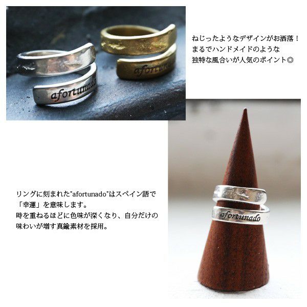 わざといびつになった形が可愛いアンティークリングが【HAWK COMPANY】より登場!このリングはホークカンパニーの、アンティークメッセージバングル(7516)とプチお揃いなイメージで作られたんです☆バングルと同じafortunado(アフォルトゥナード)とメッセージが刻まれていて、スペイン語で『幸運』を意味しています♪メッセージには墨が入っていて存在感◎真鍮そのままの色合いを活かしたゴールドと、シルバーメッキを施したシルバーのカラーがオシャレな一品です!