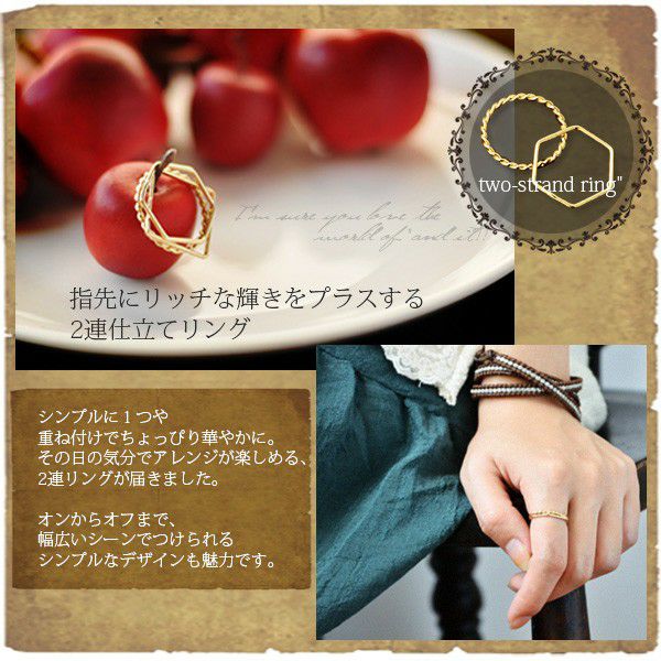 他の画像を見る 重ね付けでちょっぴり華やかにと、その日の気分でアレンジが楽しめるのも二連リング 【受注発注】重ね付けでちょっぴり華やか二連リング 【メール便対応可】 販売価格 ¥ 1,320 税込 カートに入れる お気に入りに登録する