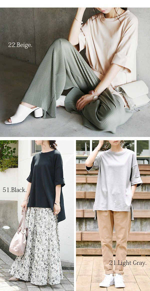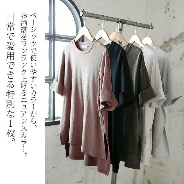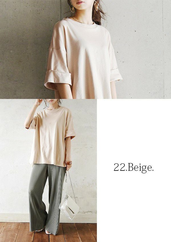 二の腕も隠れる5分袖丈にロールアップデザインでお洒落さをプラス。日本製&綿100%で着心地抜群◎ゆるっと抜け感が大人っぽいゆるカットソー☆