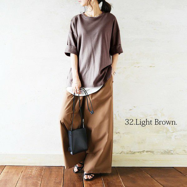 着丈は後ろの方が長く、お尻が隠れて5cm程下になりました。袖は肘がすっぽり隠れる5分袖丈に。ワイドな身幅なのでゆったりとした着心地です◎程よい厚みのある生地なので安心感がありました。