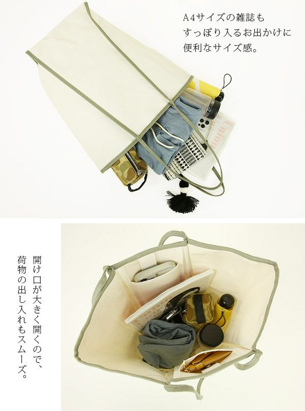 デイリー使いに最適な、無駄な装飾のないシンプルなトートバッグが登場♪A4サイズがすっぽり入るサイズと約23cmのマチで、荷物が多い時も安心。持ち手が長く、肩に掛けられるので使いやすいポイント◎メイン収納口はマグネットボタンで開け閉め簡単。開けると口が大きく開くので、荷物の出し入れもスムーズにできます。中にはスマートフォンもすっぽり入る、オープンポケットが2つデザインされていて、小物などを整理するのに便利☆内側はラミネート加工が施されているので、ペットボトルや折りたたみ傘などの濡れたものも気兼ねなく収納可能です。通勤・通学やお出かけから、エコバッグとしても使える、カラーパイピングがポイントになった、普段使いのしやすいバッグです。