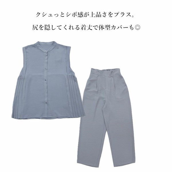 セットアップ レディース 春夏 サイドプリーツ ブラウス セット 涼感 トップス ボトムス パンツ ワイドパンツ ノースリーブ プリーツ イージーケア シワになりにくい お手入れ簡単 お尻が隠れる ウエストゴム 楽ちん ラフ 着回し オフホワイト ブラック パープル 白 黒 andit_ and it_ andit ANDIT_ ANDIT あんどいっと アンドイット SS 新作 NEW カジュアル ナチュラル きれいめ 大人可愛い 大人女子 お洒落 トレンド シンプル ニュアンス M Mサイズ L Lサイズ ゆったり 楽ちん ラフ 体型カバー ぽっちゃり プチプラ ファッション レディースファッション ママ服 20 30 40 50 20代 30代 40代 50代