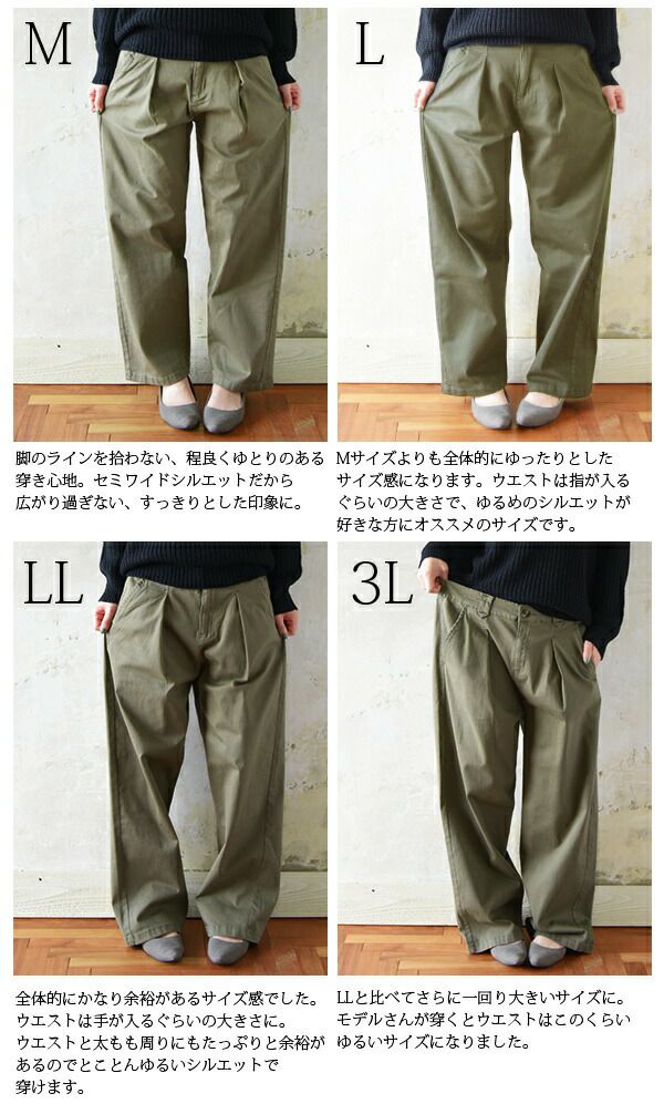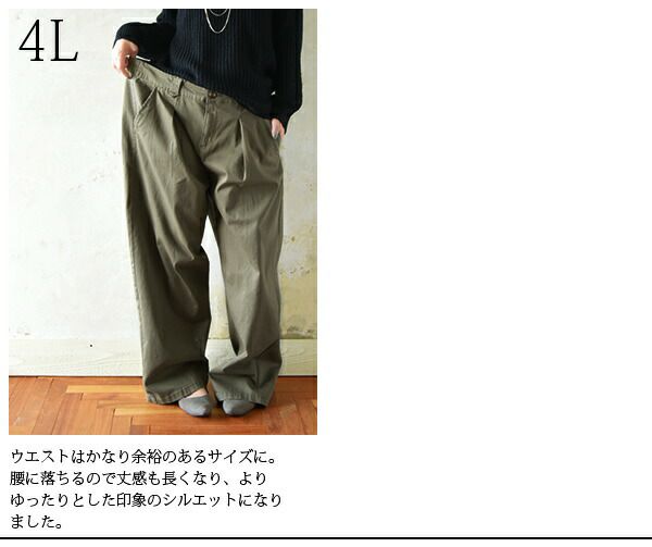 [Mサイズ]を着用しました。程よくゆとりをもって穿けるセミワイドタイプなのでシルエットもすっきり見えするのがポイント◎ルーズすぎないので小柄さんでも大人っぽく穿く事ができますよ☆ウエストで穿くとかかとを覆うくらいの長さになりました。