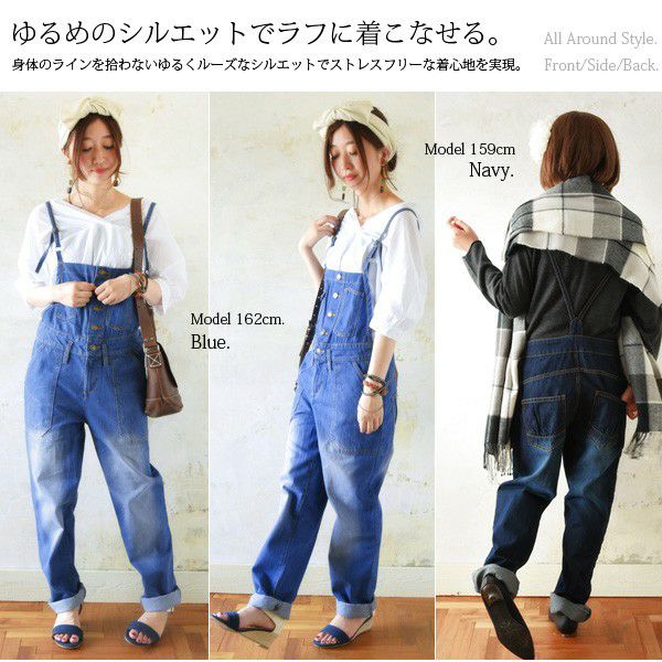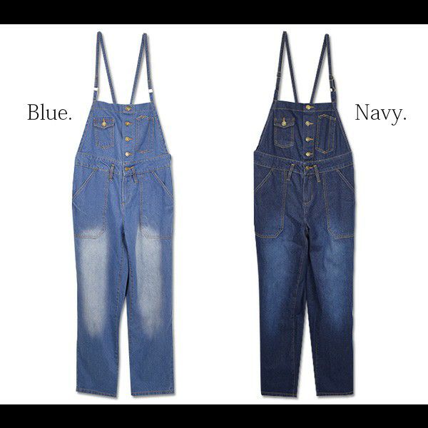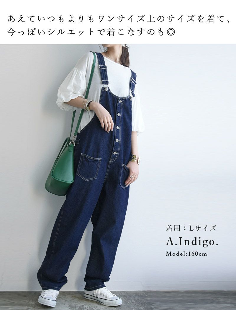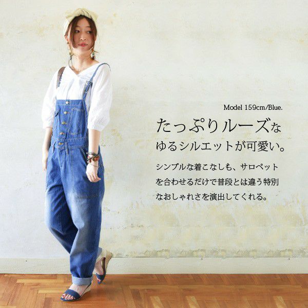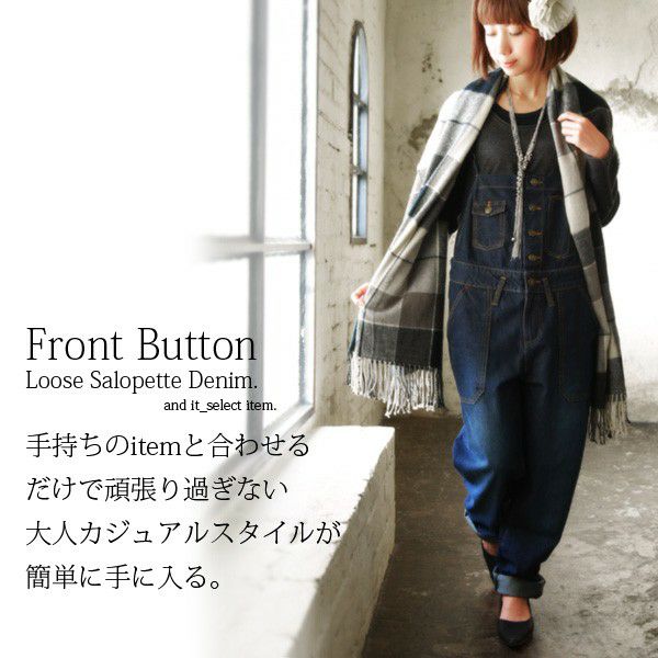 前に並んだボタンがポイント!ちょっぴりルーズなシルエットが可愛いデニムサロペット♪