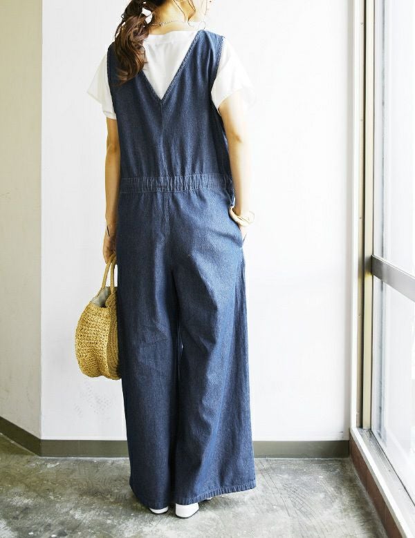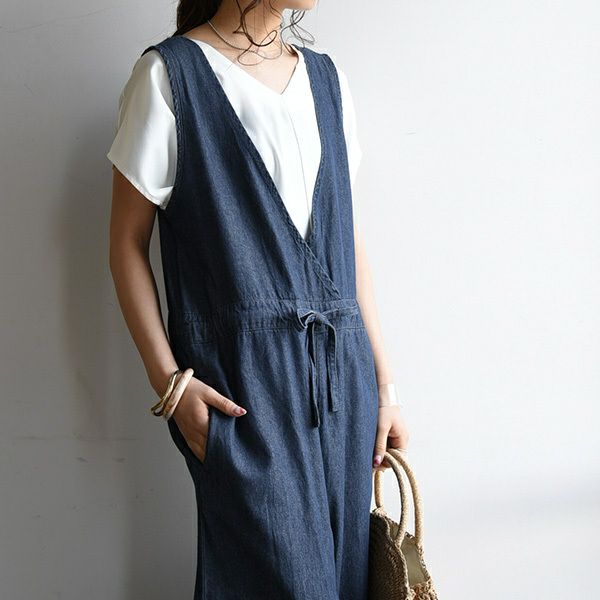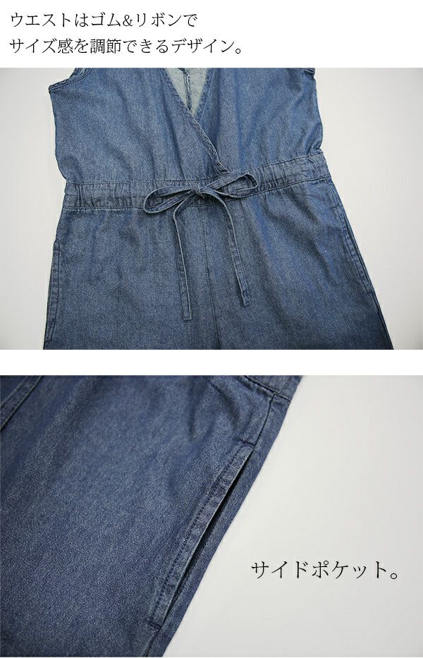 ウエストリボンで女性らしさをプラスしたカジュアルスタイルに欠かせないデニムサロペ☆ オールインワン デニム