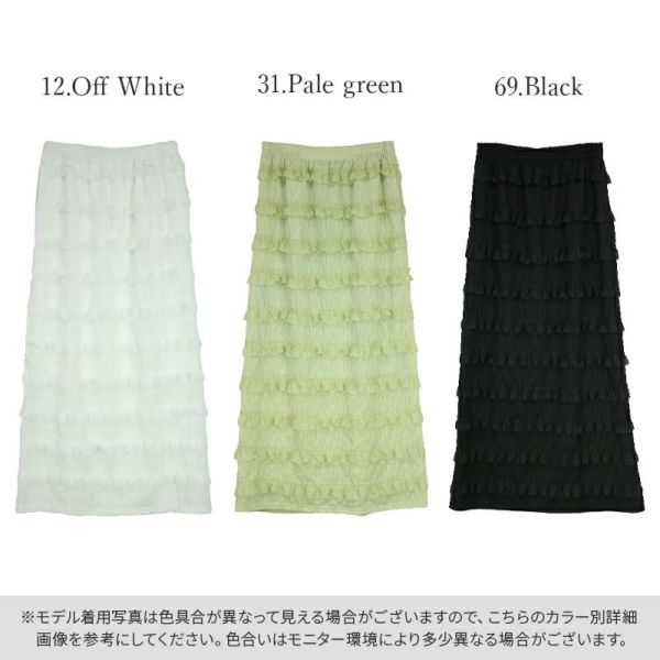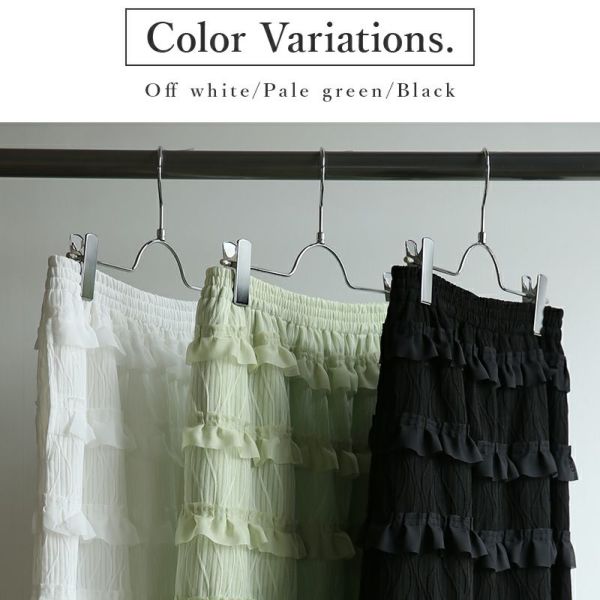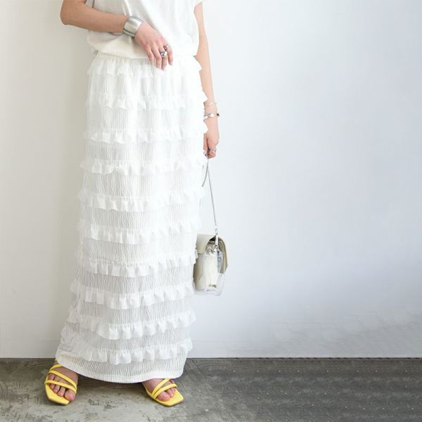 フリルがぱっと目を引く華やかさ。穿くだけでコーデをお洒落に見せてくれる上品スカート♪