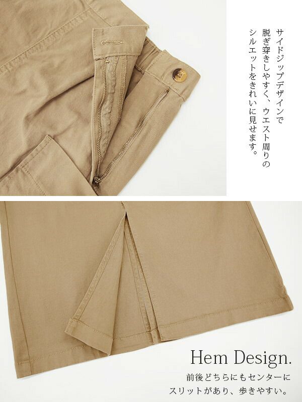 ビッグポケットとスリットの組み合わせで、女性らしい綺麗めカジュアルな雰囲気に。