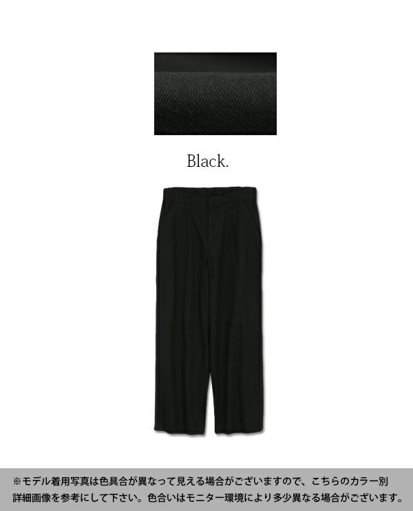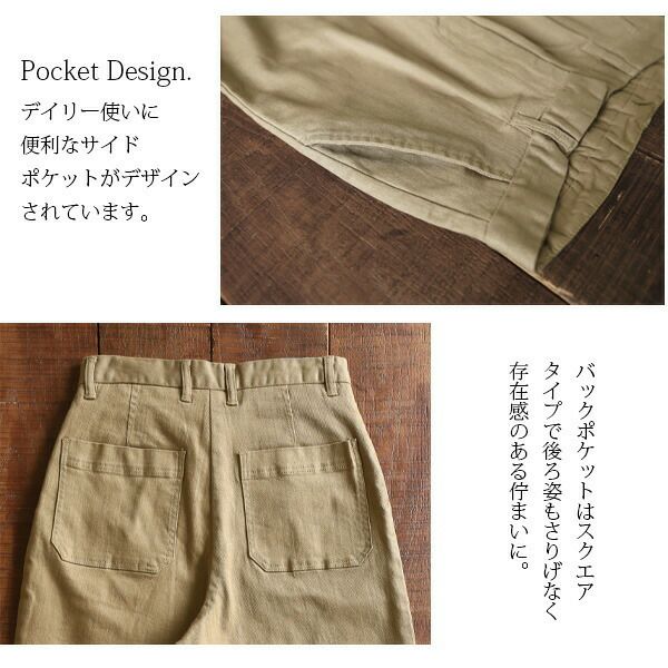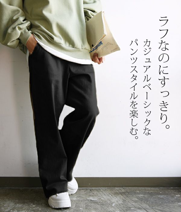 背の高い私は[Lサイズ]を着用。ウエストは片手分くらいのゆとりがありましたが、欲しかったワイドシルエットで穿けました♪着丈はウエスト位置で穿いてくるぶしにかかるくらいの長さ。やや厚みのあるしっかりとした生地ですが、柔らかな綿混素材とストレッチで脚に馴染んでくれてごわつかないのが◎