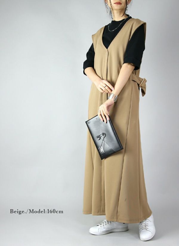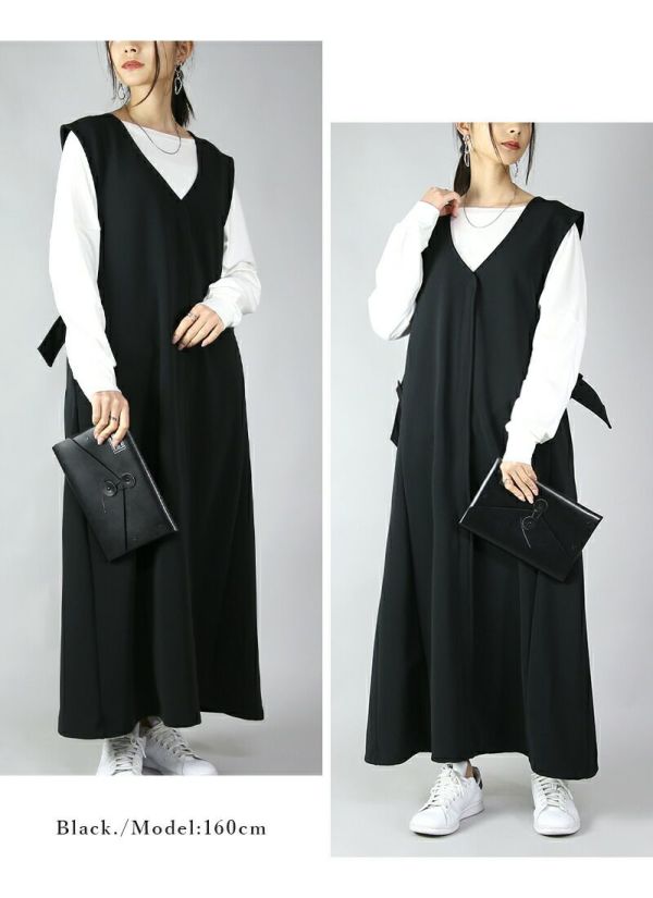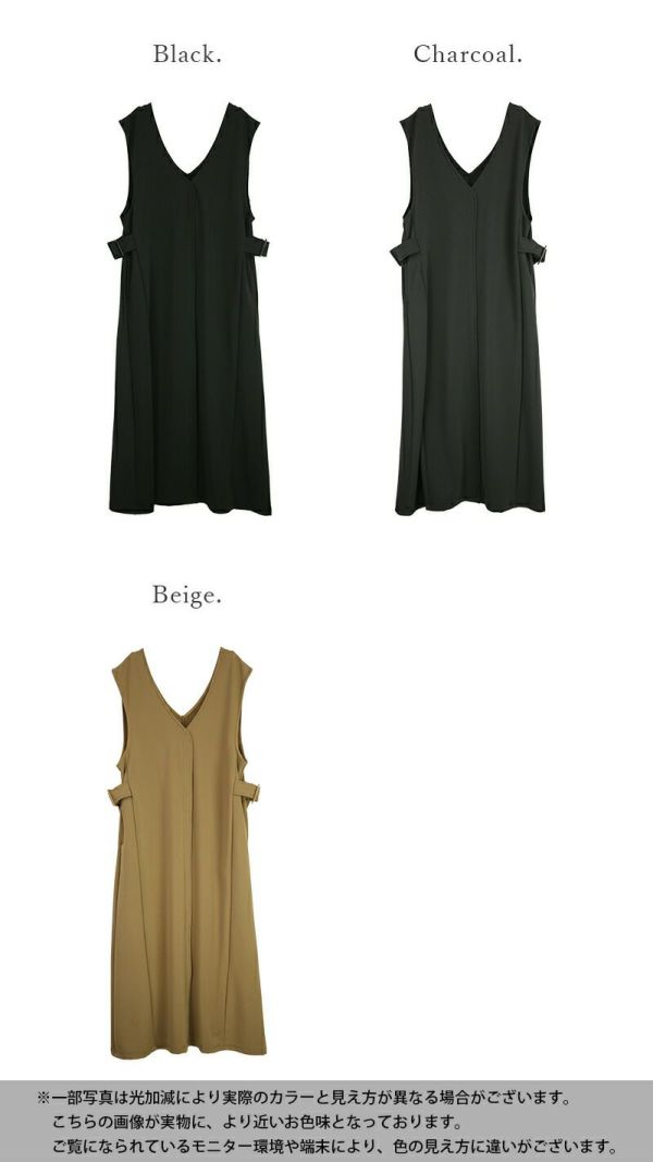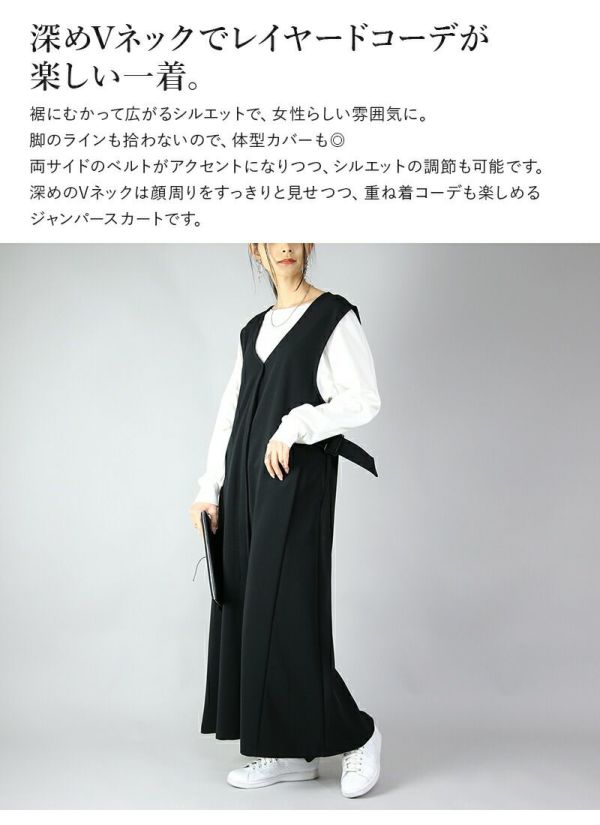 深めのVネックで顔周りすっきり!両サイドのベルトでシルエットの調節もできる着回しジャンスカ♪