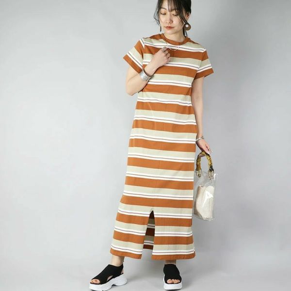 このワンピースは、カジュアルでありながら大人の可愛らしさを引き立てるデザインが特徴です。ボーダー柄と前スリットが施され、動きやすさとスタイルの良さを兼ね備えています。クルーネックと半袖の組み合わせは、春夏のリラックスした日常にぴったりです。オレンジブラウンとチャコールの色合いが、落ち着いた印象を与えます。リラックスしたい日やちょっとした外出に最適な一着です。