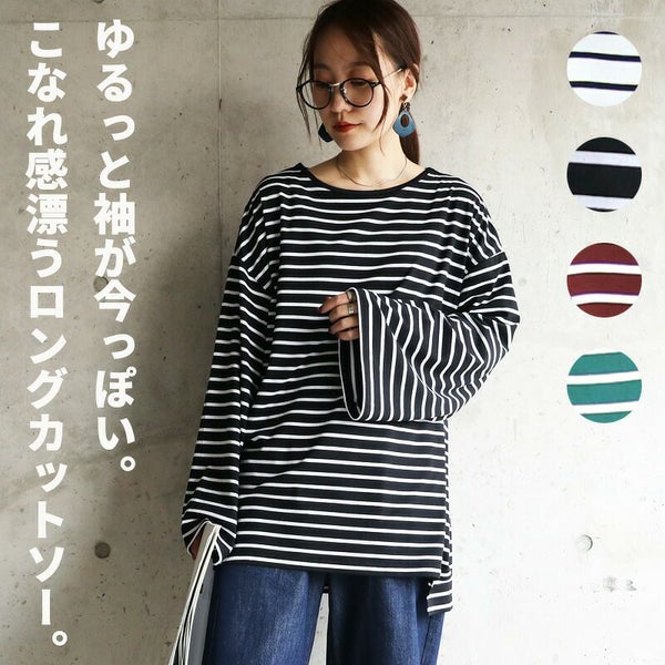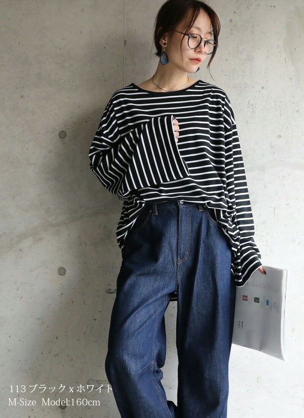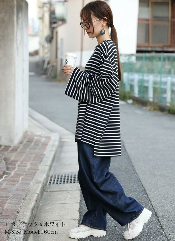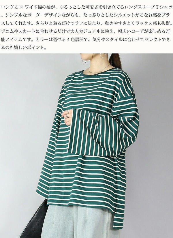 ゆったり着られるオーバーサイズのボーダーロンT。体型カバーも叶う、秋に嬉しい万能トップス。ワイド幅の袖がかわいいですよ!