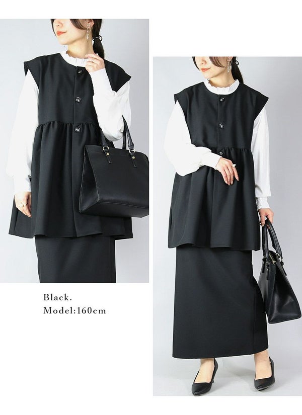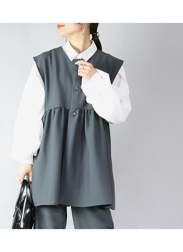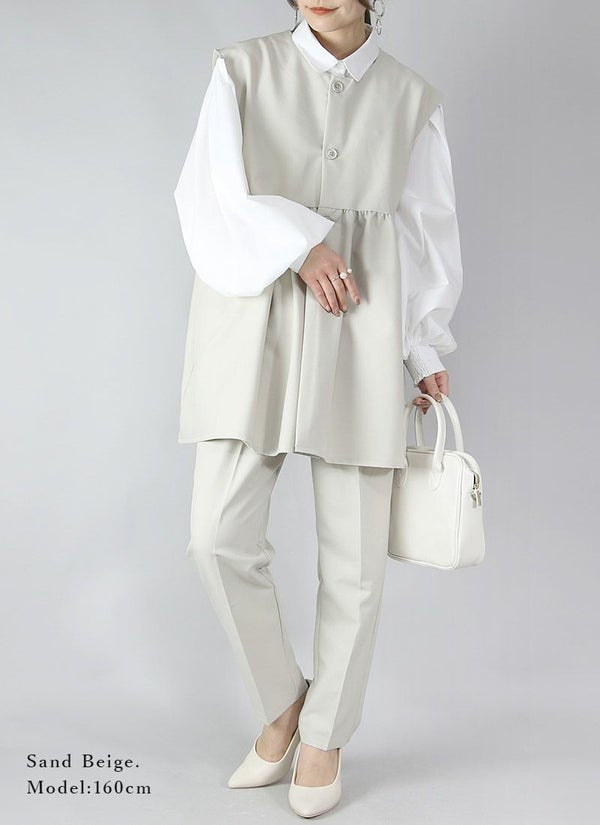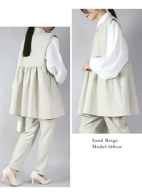 ウエストギャザーでさりげなく体型カバー。キレイめ素材で仕立てた、パンツとセットアップで着られる大人のベスト♪