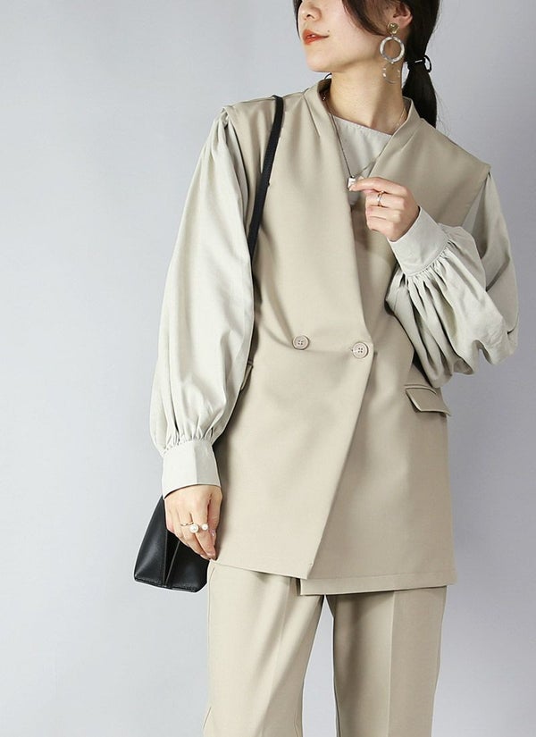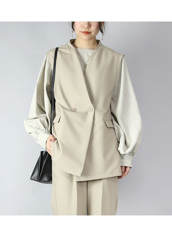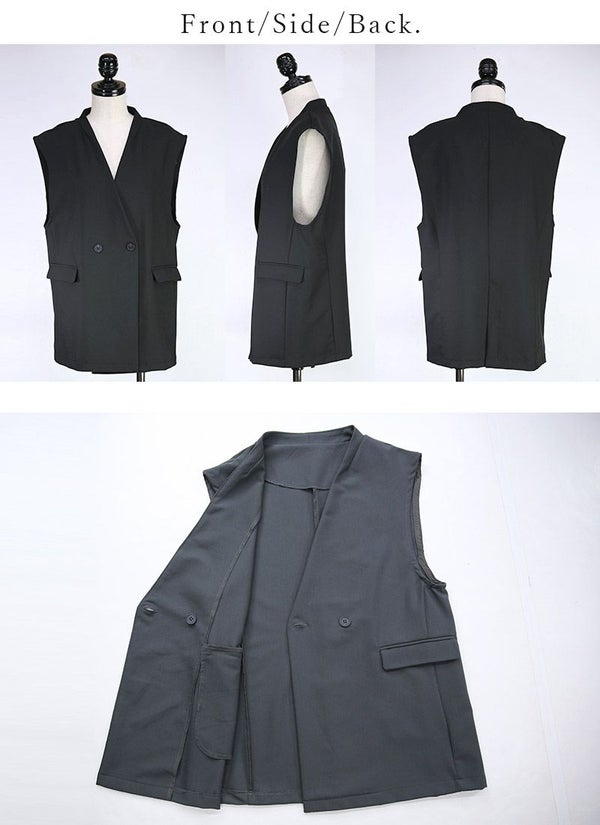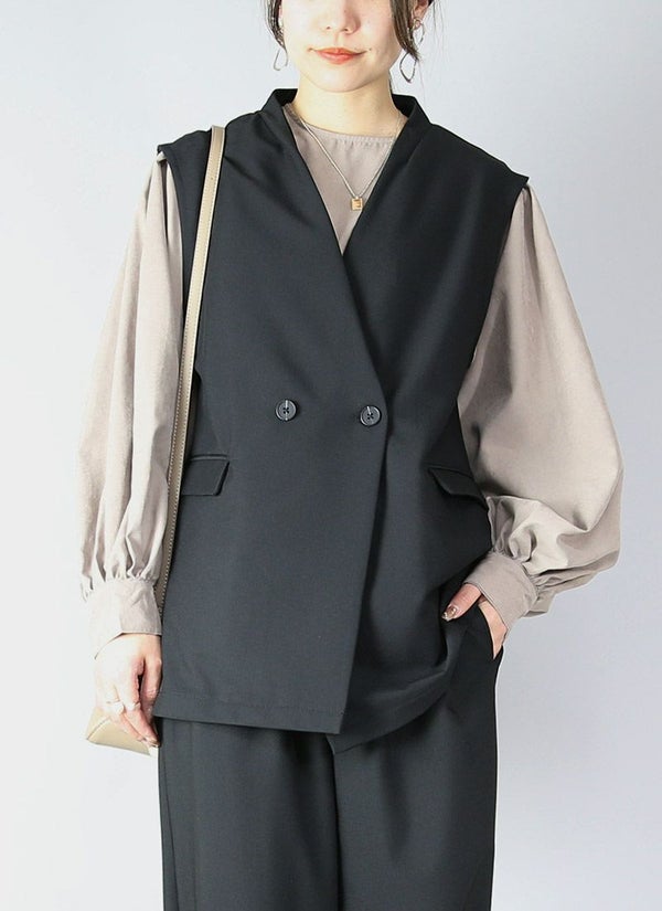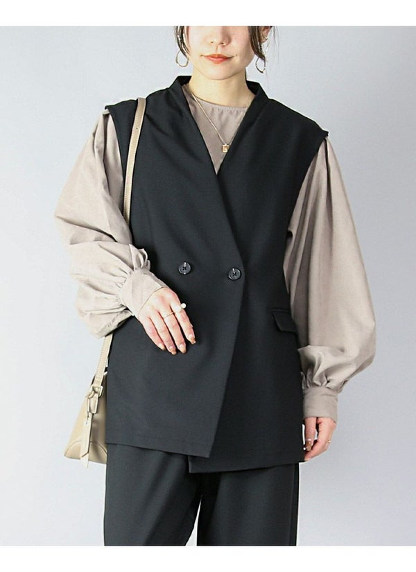 羽織るだけでジャケット見え。Wボタンとフラップポケットがきちんと感を演出する、セットアップ対応ベスト♪