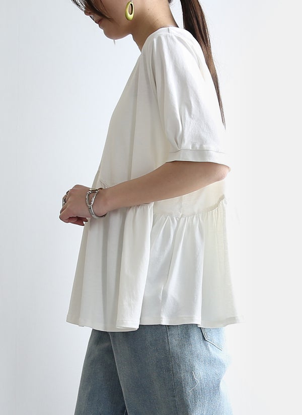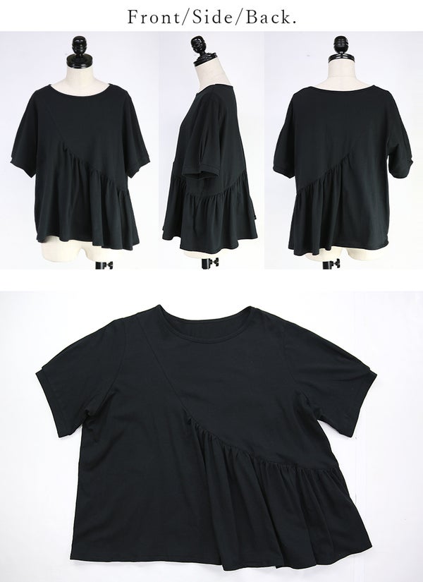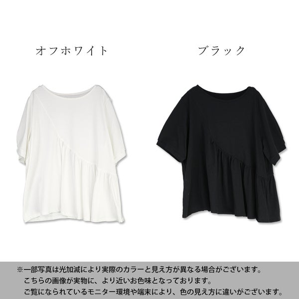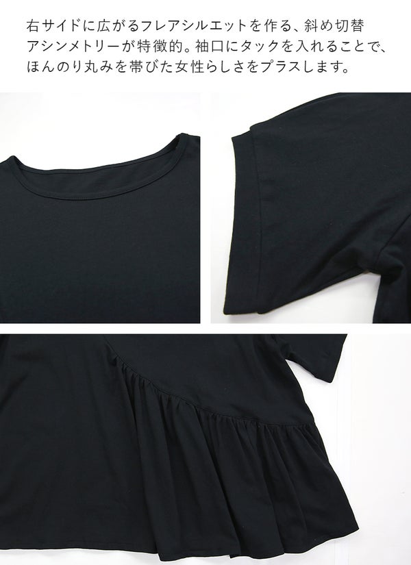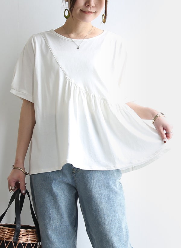 アシンメトリーで魅せる、切替デザインTシャツ。ひらっとフレアシルエットが、体型カバーも叶えます。