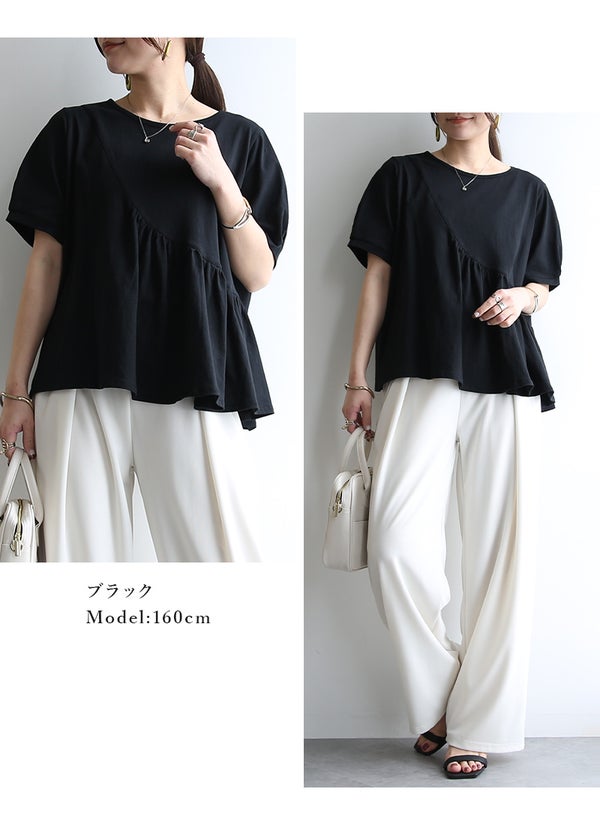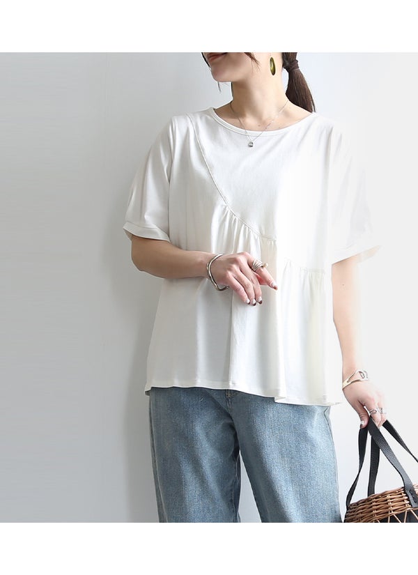 このTシャツは、斜め切替によるアシンメトリーなデザインが特徴で、個性的なスタイルを演出します。フレアシルエットが体型をカバーし、タックでやや丸みを持たせた袖が女性らしい印象を与えます。素材は綿100%のカットソー生地を使用しており、肌触りが良く、快適な着心地を提供します。薄手で軽やかなため、春から夏にかけてのカジュアルな日常使いに最適です。ホワイトとブラックのシンプルな色展開で、さまざまなコーディネートに合わせやすく、着回し力も抜群です。