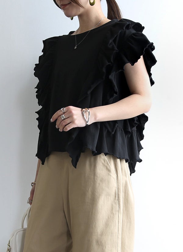 甘すぎないフリルで、大人の装いにちょうどいい華やかさ。