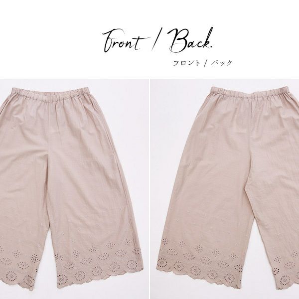背の高い私がウエストで穿いて、くるぶしが見えるくらいのロング丈でした。裾のレース部分が涼しげな抜け感POINTに◎ウエストには伸縮性のあるゴムを使っているので、ゆったり穿けました!脚のラインにフィットしないワイドシルエットがGOOD♪