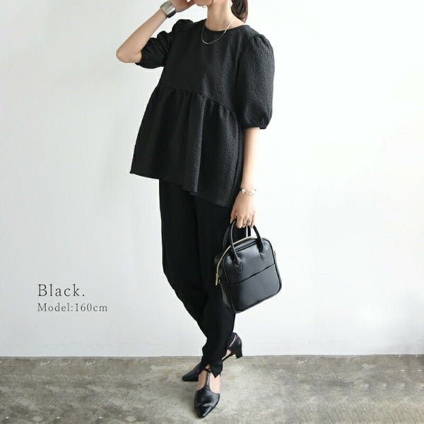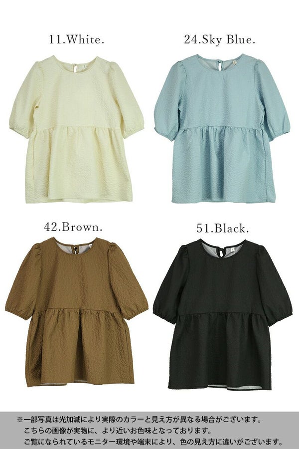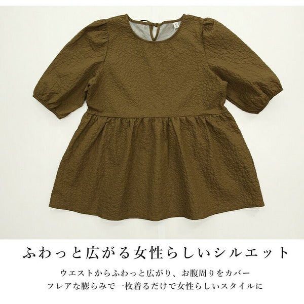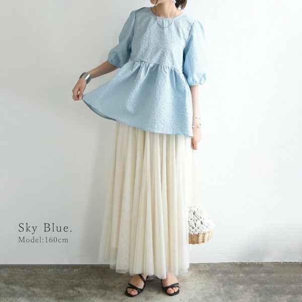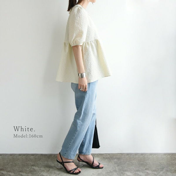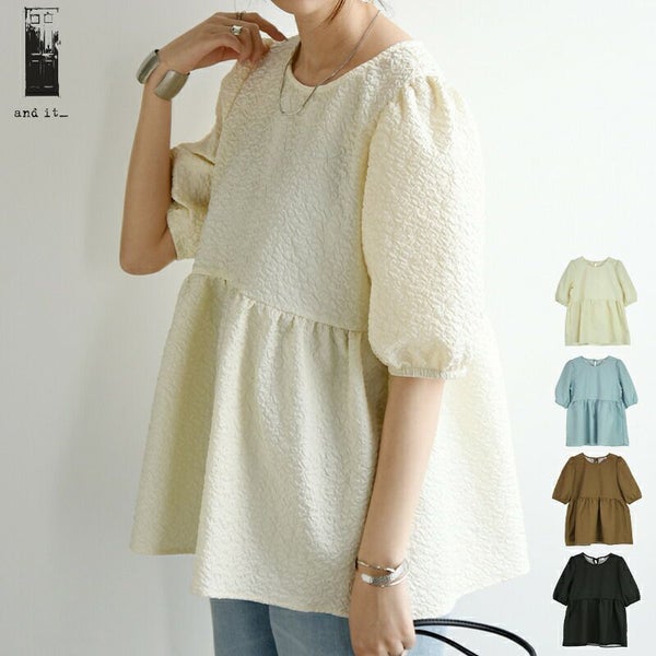 トップス ブラウス レディース 春 夏 ふくれ ジャガード パフスリーブ ボリュームスリーブ 半袖 五分袖 二の腕カバー 凹凸 立体感 ハリ感 ペプラム ふんわり バックリボン ホワイト ブラック スカイブルー ブラウン 黒 白 M L andit_ and it_ andit ANDIT_ ANDIT あんどいっと アンドイット SS 新作 NEW カジュアル ナチュラル きれいめ 大人可愛い 大人女子 お洒落 トレンド シンプル ニュアンス ゆったり 楽ちん ラフ 体型カバー ぽっちゃり プチプラ ファッション レディースファッション ママ服 20 30 40 50 20代 30代 40代 50代
