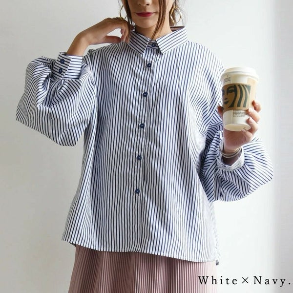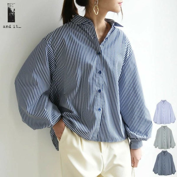 トップス シャツ ストライプ ストライプシャツ 柄シャツ ボリューム袖 ボリュームスリーブ ぽわん袖 春夏 長袖 春服 夏服 ブルー ネイビー ホワイト 春シャツ 前開き 羽織 羽織り 重ね着 レイヤード 二の腕カバー スタイルカバー andit_ and it_ andit ANDIT_ ANDIT あんどいっと アンドイット SS 新作 NEW カジュアル ナチュラル きれいめ 大人可愛い 大人女子 お洒落 トレンド シンプル ニュアンス M Mサイズ ゆったり 楽ちん ラフ 体型カバー ぽっちゃり プチプラ ファッション レディースファッション ママ服 20 30 40 50 20代 30代 40代 50代