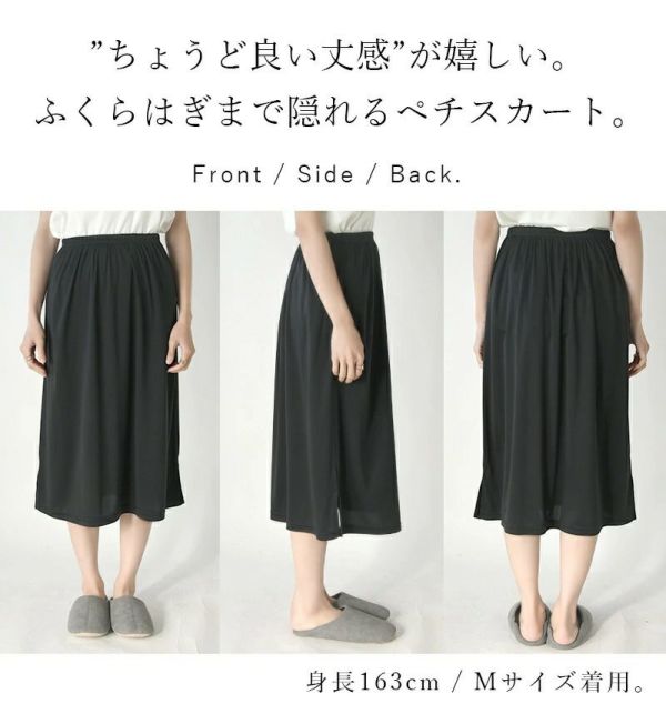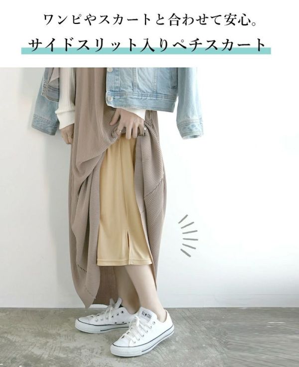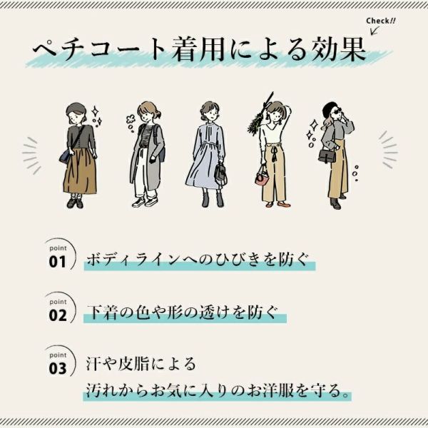 ペチワンピ・スカート・パンツだけだと不安…なんて人にはペチコートの重ね着を おすすめ!下着のラインはもちろん、ひざ下までのシルエットラインを透ける事なく 完全にカバーしてくれます!