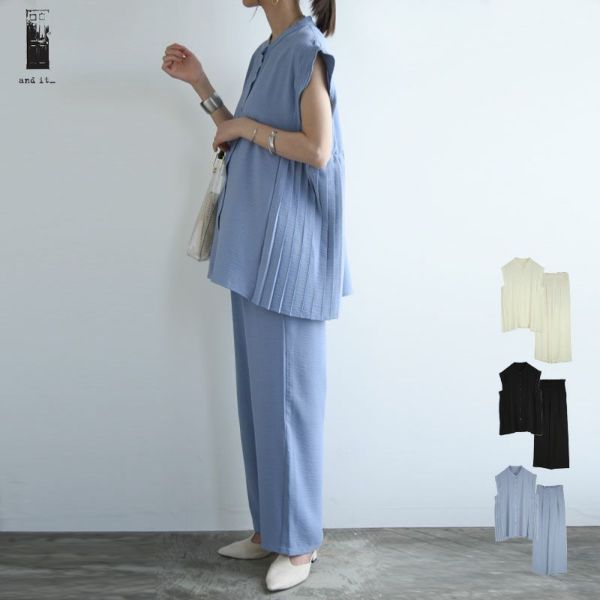 セットアップ レディース 春夏 サイドプリーツ ブラウス セット 涼感 トップス ボトムス パンツ ワイドパンツ ノースリーブ プリーツ イージーケア シワになりにくい お手入れ簡単 お尻が隠れる ウエストゴム 楽ちん ラフ 着回し オフホワイト ブラック パープル 白 黒 andit_ and it_ andit ANDIT_ ANDIT あんどいっと アンドイット SS 新作 NEW カジュアル ナチュラル きれいめ 大人可愛い 大人女子 お洒落 トレンド シンプル ニュアンス M Mサイズ L Lサイズ ゆったり 楽ちん ラフ 体型カバー ぽっちゃり プチプラ ファッション レディースファッション ママ服 20 30 40 50 20代 30代 40代 50代