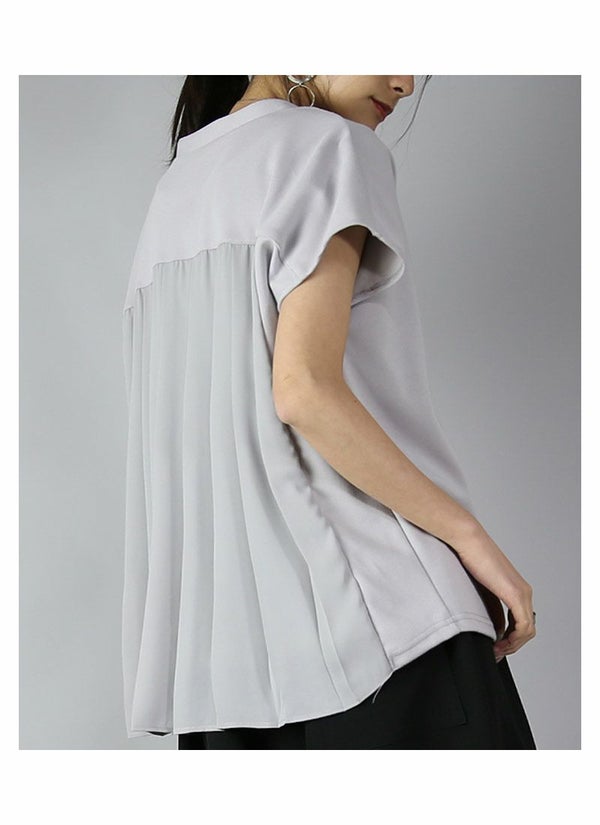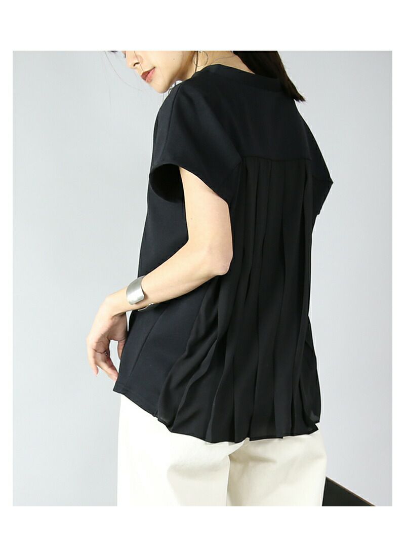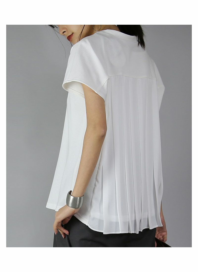 異素材プリーツで後ろ姿も上品な印象に。ふんわり軽やか、女性らしさをプラス。