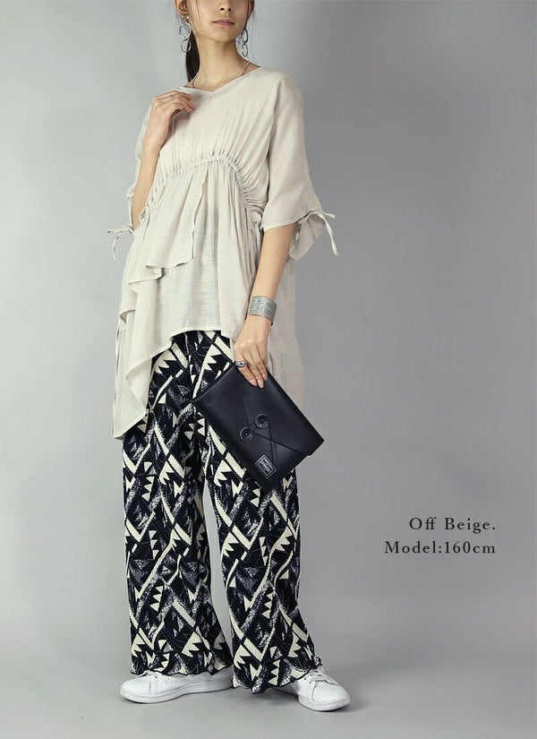 ふんわりギャザーで女性らしいナチュラルな印象に。スラブ生地で見た目も着心地も涼感漂う。ふんわり 女性らしい