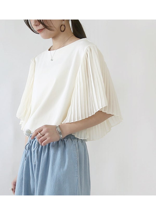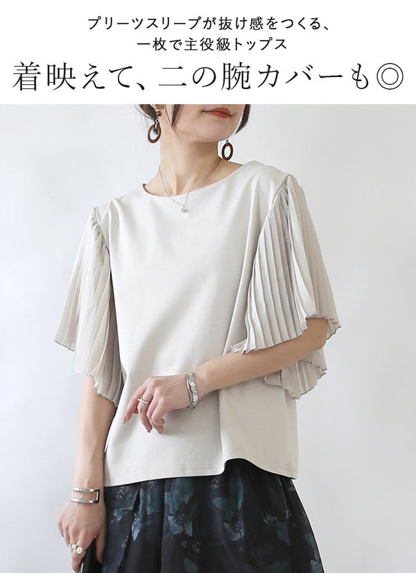 シアープリーツが二の腕をカバーしつつ華やかな印象に。1枚で気映えする優秀プルオーバー◎