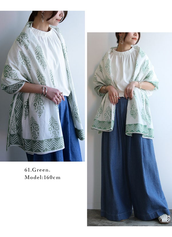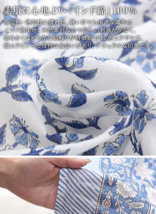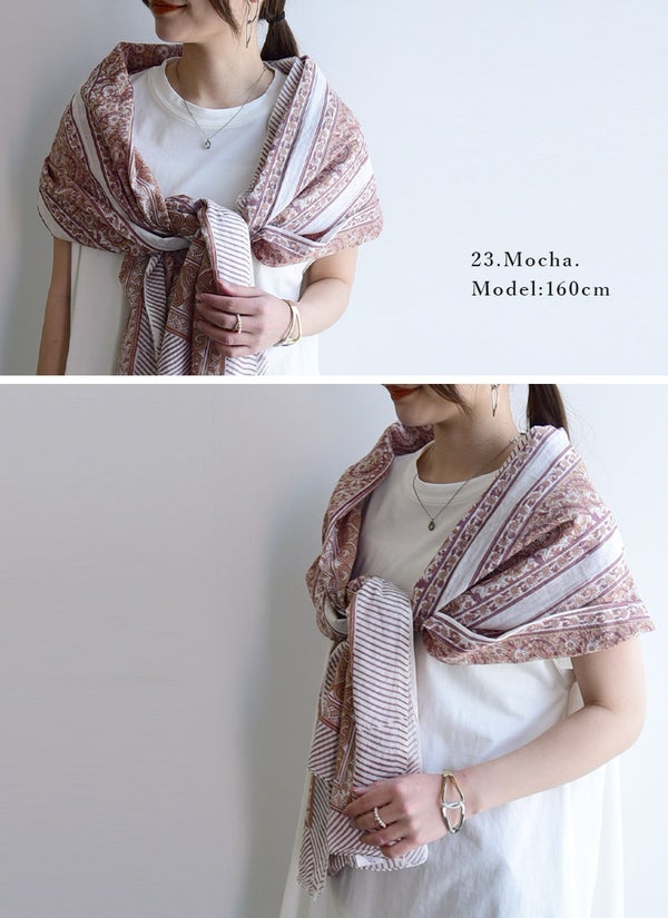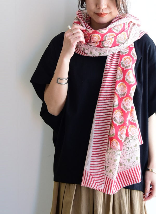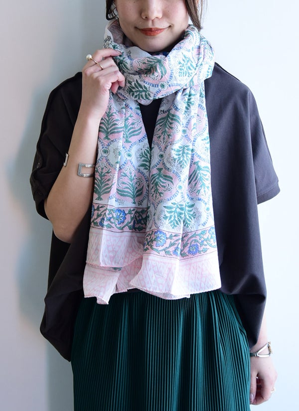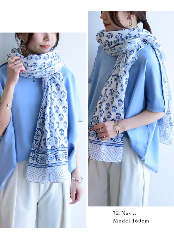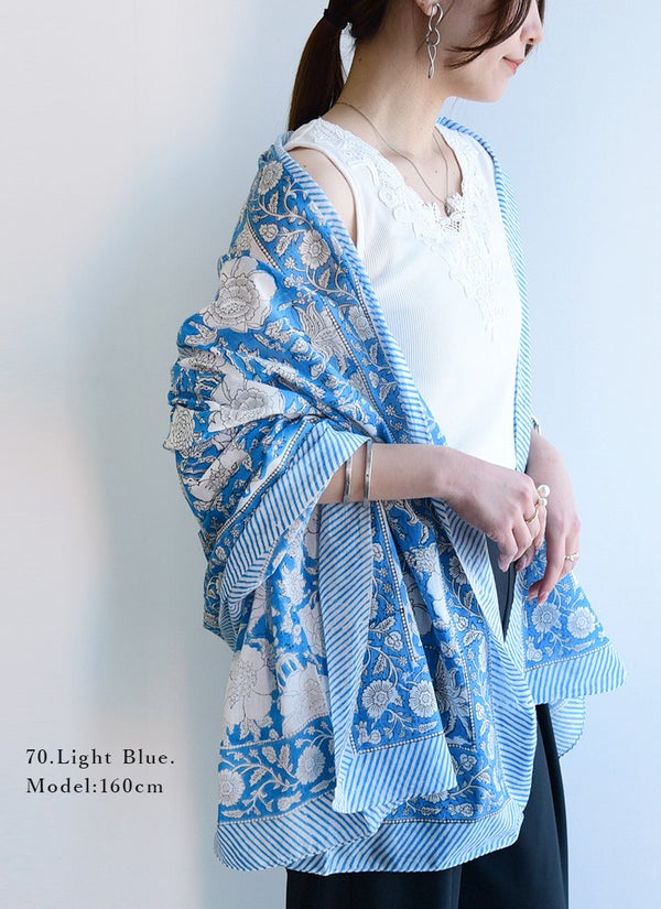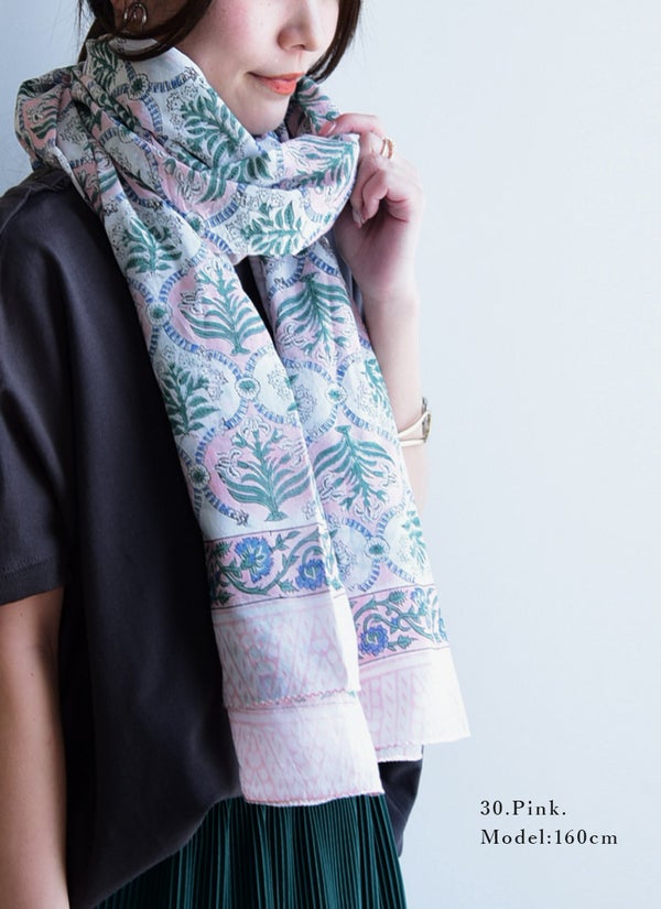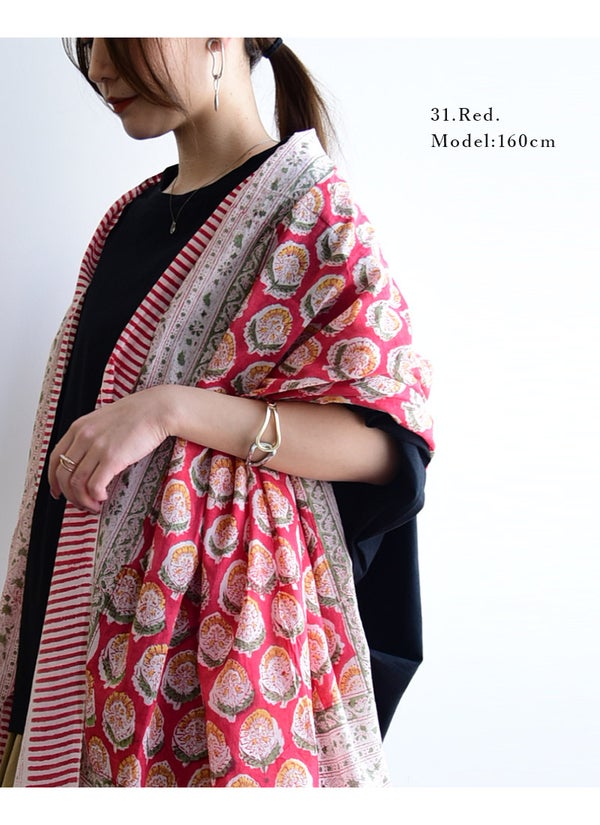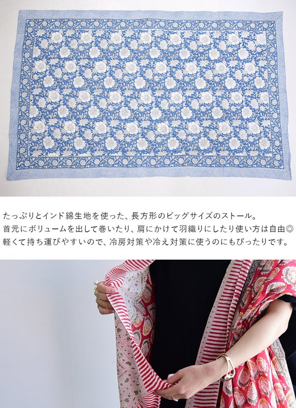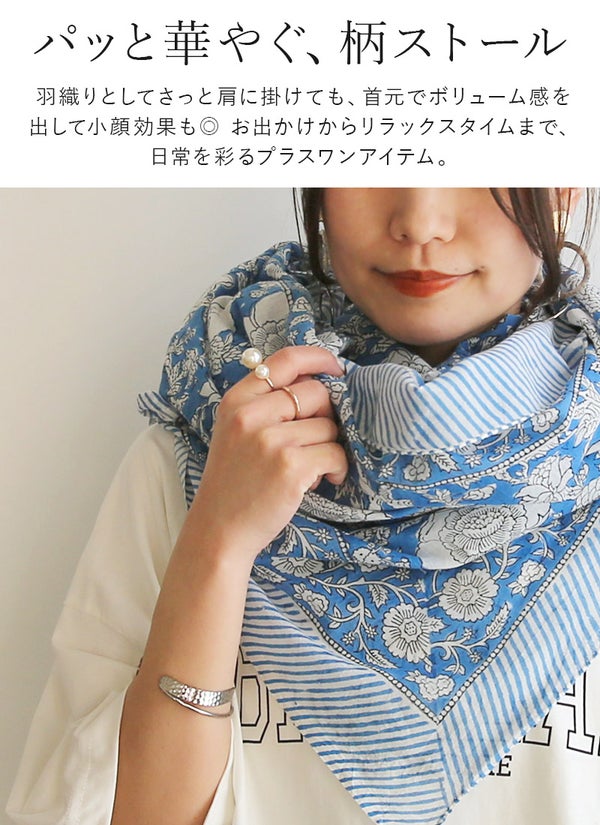 蒸し暑い日でもベタつかず、さらりと爽やかな肌触りのインド綿。お出かけからリラックスタイムまで、毎日をパッと華やかに彩る柄ストール