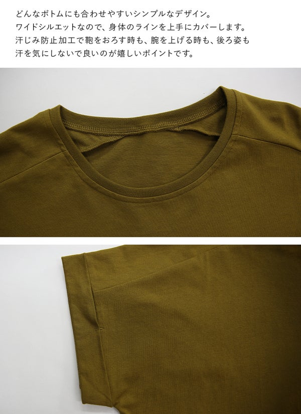 汗じみ防止加工で快適な着心地をキープ!ラフに着られるワイドシルエットで体型カバーも叶う。