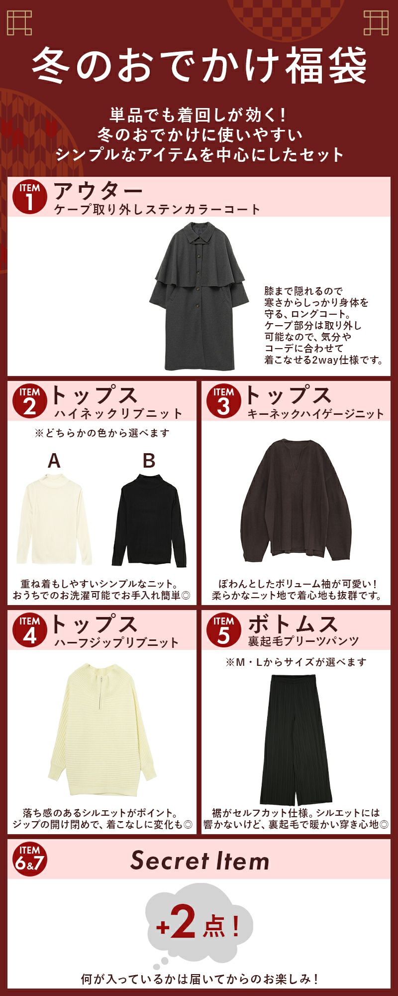トップス ボトムス レディース アウターが入る冬のお出かけ福袋 M A ハイネック リブニット キーネック プルオーバー ハーフジップドルマンニット ステンカラーコート ケープ 裏起毛パンツ 5点セット お洒落 大人可愛い カジュアル 秋 冬 AW 新作 NEW ニュー カジュアル かじゅある ナチュラル なちゅらる 女性 綺麗 綺麗目 綺麗め きれいめ キレイメ キレイめ きれい キレイ 可愛い かわいい カワイイ カッコいい かっこいい 格好良い カッコイイ 大人 オトナ おとな オトナカワイイ おとなかわいい 大人可愛い 大人女子 おとなじょし オトナジョシ お洒落 おしゃれ オシャレ トレンド 旬 とれんど 流行 こなれ感 こなれ 高見え 上質 上品 シンプル ニュアンス ラクチン らくちん 楽ちん 楽 動きやすい ゆったり ゆる ゆったりサイズ ゆるカジ ゆるい ゆるファッション 体型カバー プラスサイズ 大きいサイズ ビッグ ビック big ビックシルエット ビッグシルエット ビックサイズ ビッグサイズ オーバーサイズ オーバー フリーサイズ フリー S M L LL 2L XL 3L XXL LLL 着痩せ 着回し 華奢見せ 華奢見え ベーシック プチプラ ファッション レディースファッション レディファ カジュアルコーデ 大人コーデ オトナコーデ 大人カジュアルコーデ きれいめコーデ きれいめカジュアルコーデ オフィスカジュアルコーデ オフィスカジュアル オフィス テレワーク リモートワーク リモート オンライン飲み会 飲み会 打ち上げ ご飯会 ランチ おうち時間 お家時間 デート お出かけ フェス リゾート ビーチ 海 旅行 飛行機 パーティー パーティ 韓国ファッション 韓国コーデ 韓国風 韓国 母の日 母のひ プレゼント ギフト 贈り物 クリスマス 誕生日 春 夏 秋 冬 春夏 秋冬 andit_ and it_ andit ANDIT_ ANDIT あんどいっと アンドイット 20 30 40 50 60 20代 30代 40代 50代 60代
