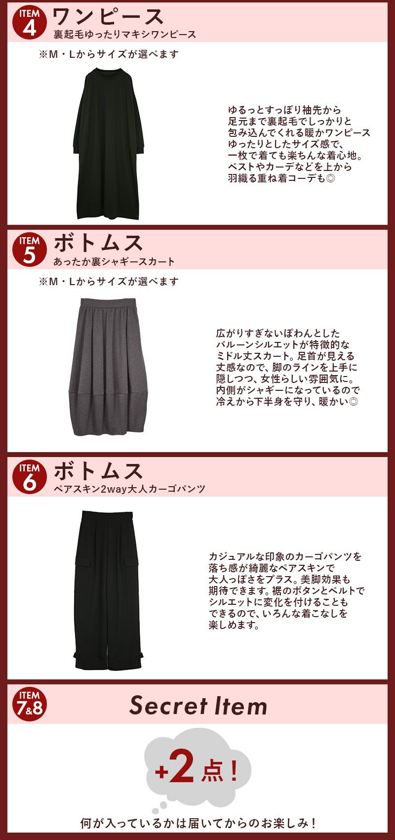 トップス ボトムス レディース ゆったり大好きカジュアル福袋 M -裏起毛 スェット あったか レイヤード マキシワンピ スカート カーゴパンツ お洒落 大人可愛い カジュアル 秋 冬 AW 新作 NEW ニュー カジュアル かじゅある ナチュラル なちゅらる 女性 綺麗 綺麗目 綺麗め きれいめ キレイメ キレイめ きれい キレイ 可愛い かわいい カワイイ カッコいい かっこいい 格好良い カッコイイ 大人 オトナ おとな オトナカワイイ おとなかわいい 大人可愛い 大人女子 おとなじょし オトナジョシ お洒落 おしゃれ オシャレ トレンド 旬 とれんど 流行 こなれ感 こなれ 高見え 上質 上品 シンプル ニュアンス ラクチン らくちん 楽ちん 楽 動きやすい ゆったり ゆる ゆったりサイズ ゆるカジ ゆるい ゆるファッション 体型カバー プラスサイズ 大きいサイズ ビッグ ビック big ビックシルエット ビッグシルエット ビックサイズ ビッグサイズ オーバーサイズ オーバー フリーサイズ フリー S M L LL 2L XL 3L XXL LLL 着痩せ 着回し 華奢見せ 華奢見え ベーシック プチプラ ファッション レディースファッション レディファ カジュアルコーデ 大人コーデ オトナコーデ 大人カジュアルコーデ きれいめコーデ きれいめカジュアルコーデ オフィスカジュアルコーデ オフィスカジュアル オフィス テレワーク リモートワーク リモート オンライン飲み会 飲み会 打ち上げ ご飯会 ランチ おうち時間 お家時間 デート お出かけ フェス リゾート ビーチ 海 旅行 飛行機 パーティー パーティ 韓国ファッション 韓国コーデ 韓国風 韓国 母の日 母のひ プレゼント ギフト 贈り物 クリスマス 誕生日 春 夏 秋 冬 春夏 秋冬 andit_ and it_ andit ANDIT_ ANDIT あんどいっと アンドイット 20 30 40 50 60 20代 30代 40代 50代 60代