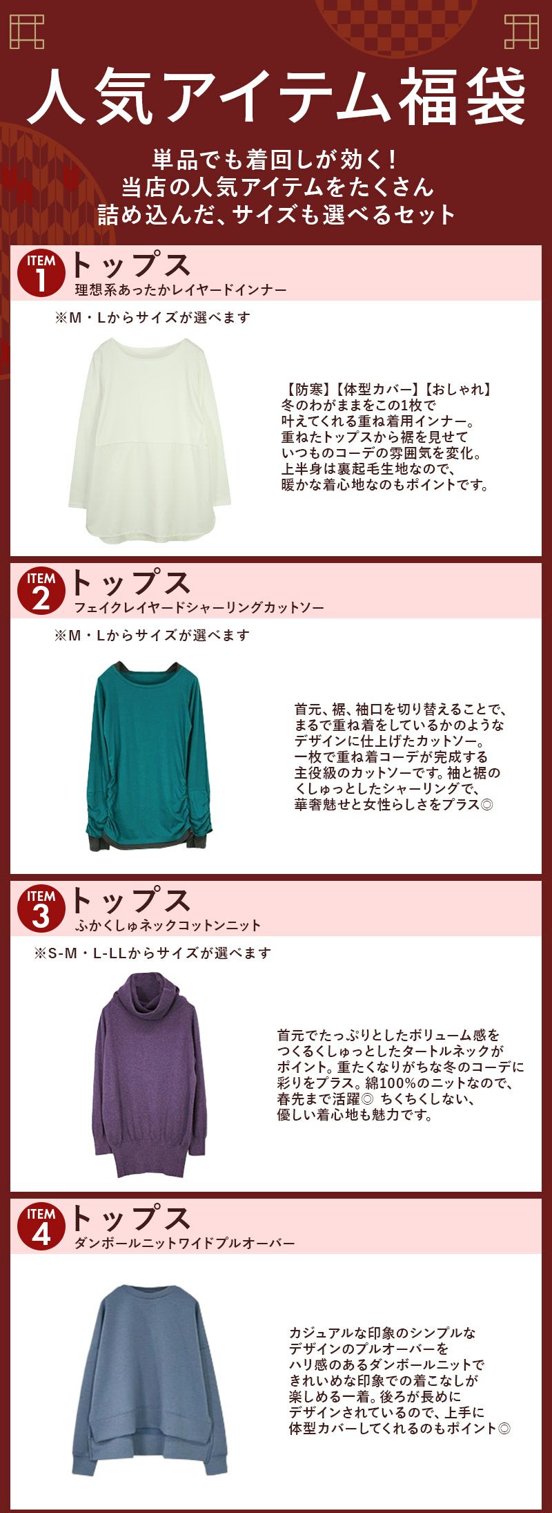 トップス ボトムス レディース 人気アイテムてんこ盛り福袋 M - あったか レイヤード オフタートルニット ダンボールニット ワイドプルオーバー ゆったりマキシワンピース 裏シャギースカート 裏起毛プリーツパンツ お洒落 大人可愛い カジュアル 秋 冬 AW 新作 NEW ニュー カジュアル かじゅある ナチュラル なちゅらる 女性 綺麗 綺麗目 綺麗め きれいめ キレイメ キレイめ きれい キレイ 可愛い かわいい カワイイ カッコいい かっこいい 格好良い カッコイイ 大人 オトナ おとな オトナカワイイ おとなかわいい 大人可愛い 大人女子 おとなじょし オトナジョシ お洒落 おしゃれ オシャレ トレンド 旬 とれんど 流行 こなれ感 こなれ 高見え 上質 上品 シンプル ニュアンス ラクチン らくちん 楽ちん 楽 動きやすい ゆったり ゆる ゆったりサイズ ゆるカジ ゆるい ゆるファッション 体型カバー プラスサイズ 大きいサイズ ビッグ ビック big ビックシルエット ビッグシルエット ビックサイズ ビッグサイズ オーバーサイズ オーバー フリーサイズ フリー S M L LL 2L XL 3L XXL LLL 着痩せ 着回し 華奢見せ 華奢見え ベーシック プチプラ ファッション レディースファッション レディファ カジュアルコーデ 大人コーデ オトナコーデ 大人カジュアルコーデ きれいめコーデ きれいめカジュアルコーデ オフィスカジュアルコーデ オフィスカジュアル オフィス テレワーク リモートワーク リモート オンライン飲み会 飲み会 打ち上げ ご飯会 ランチ おうち時間 お家時間 デート お出かけ フェス リゾート ビーチ 海 旅行 飛行機 パーティー パーティ 韓国ファッション 韓国コーデ 韓国風 韓国 母の日 母のひ プレゼント ギフト 贈り物 クリスマス 誕生日 春 夏 秋 冬 春夏 秋冬 andit_ and it_ andit ANDIT_ ANDIT あんどいっと アンドイット 20 30 40 50 60 20代 30代 40代 50代 60代