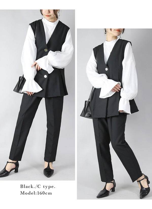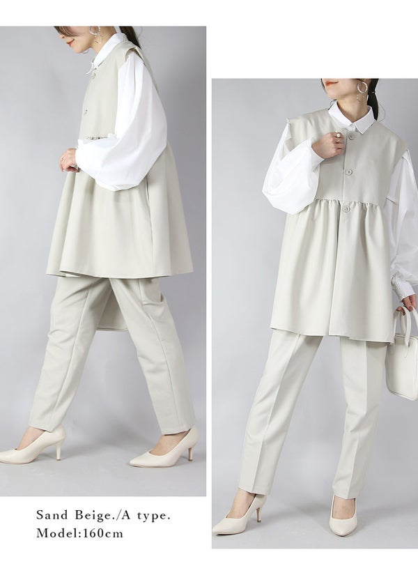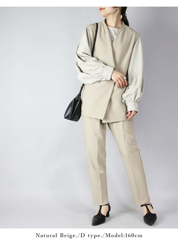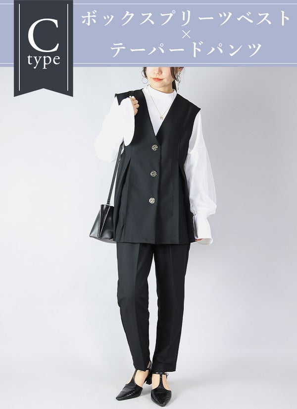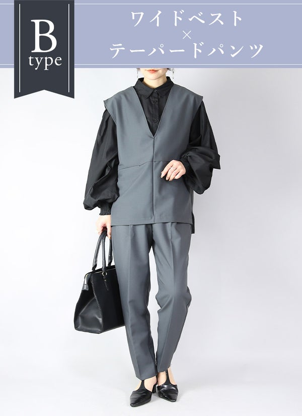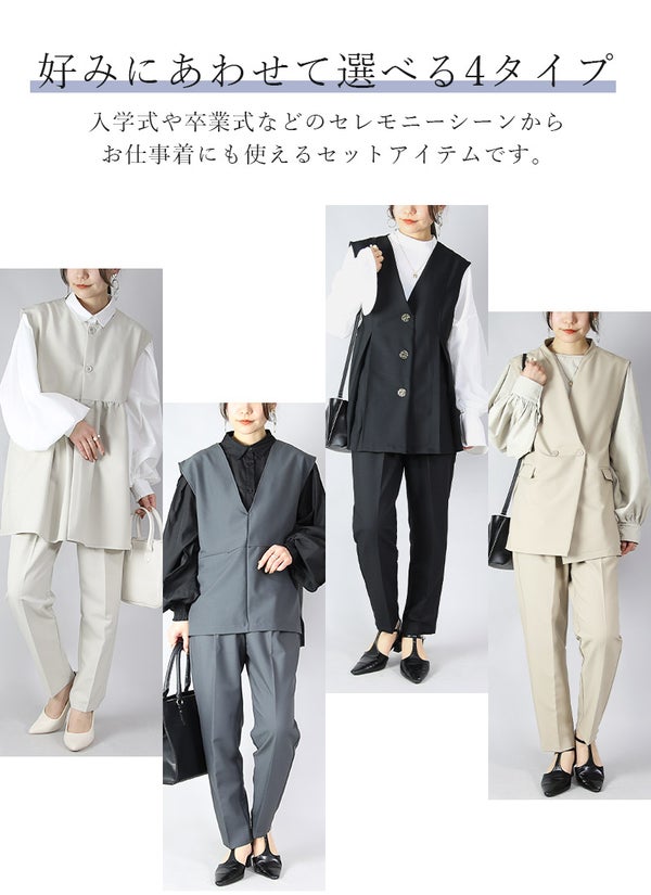 入学式・卒業式などの特別な日からお仕事などにも大活躍!気になるラインをカバーしつつ旬の着こなしが叶うベスト×コクーンパンツのフォーマルコーデコーデセット。