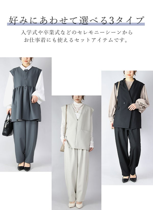 入学式・卒業式などの特別な日からお仕事などにも大活躍!気になるラインをカバーしつつ旬の着こなしが叶うベスト×コクーンパンツのフォーマルコーデコーデセット。